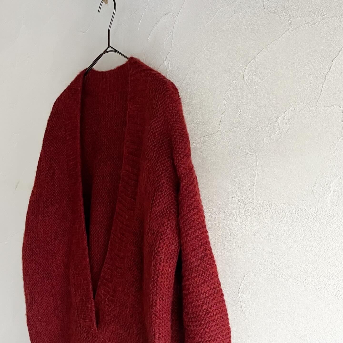 潔く深いVネックが目を惹くモヘアニットです。くすみがかかったレッドカラーは肌馴染みが良くコーディネートのポイントにもなります。インナー次第で様々な着こなしを楽しんで頂ける1着です。