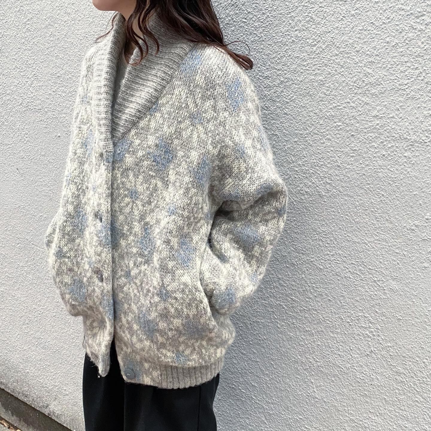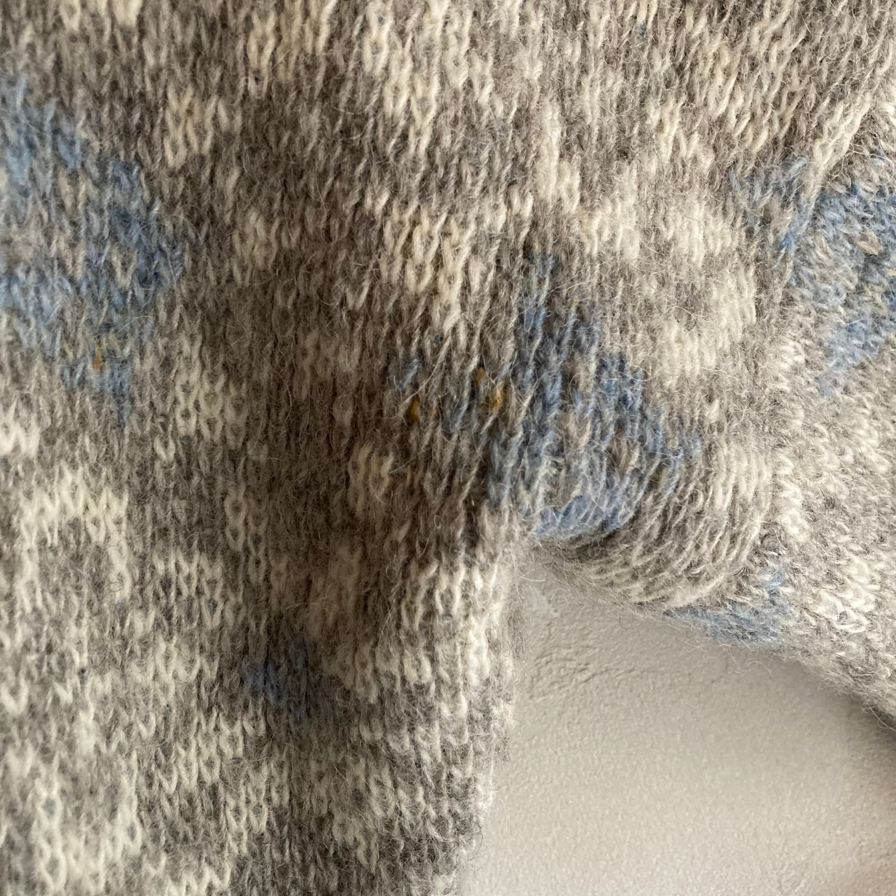 グレーベースにホワイトやブルーのノルディック柄が冬らしいニットジャケットです。100% ウールで裏地もしっかりしているので暖かくお召し頂けます。