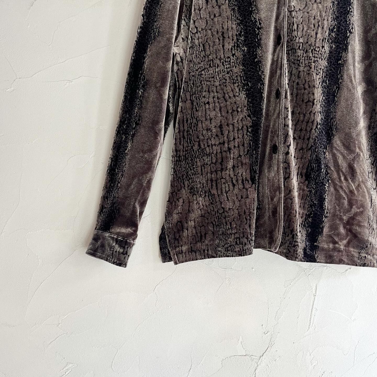 さりげないパイソン柄がお洒落なベロアシャツです。ゆったりとして落ち感もあり、色味も柔らかいので女性らしくお召し頂ける1着です。