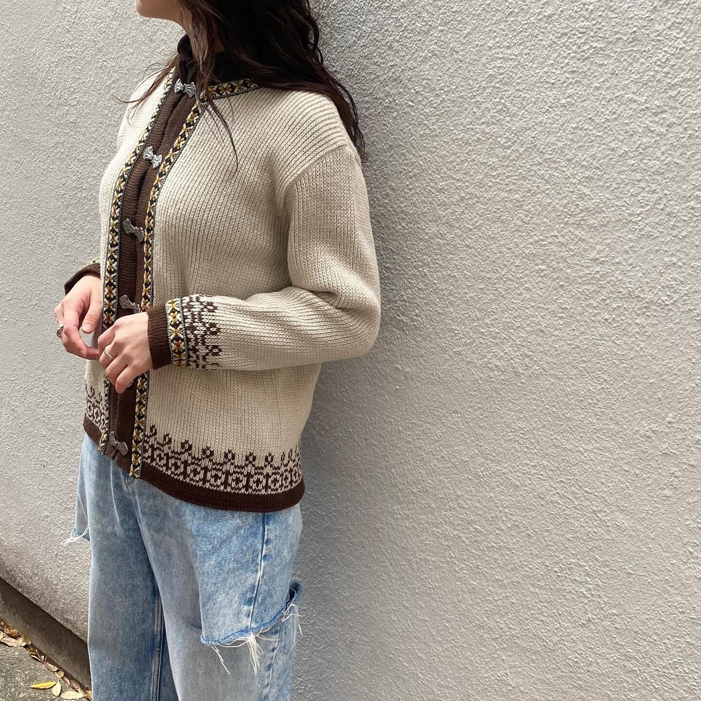 ベージュカラーベースにイエロー×ブラックのチロリアンテープがポイントになったニットカーディガンです。控えめな柄と落ち着いたカラーリングは大人でも着やすい1着です。