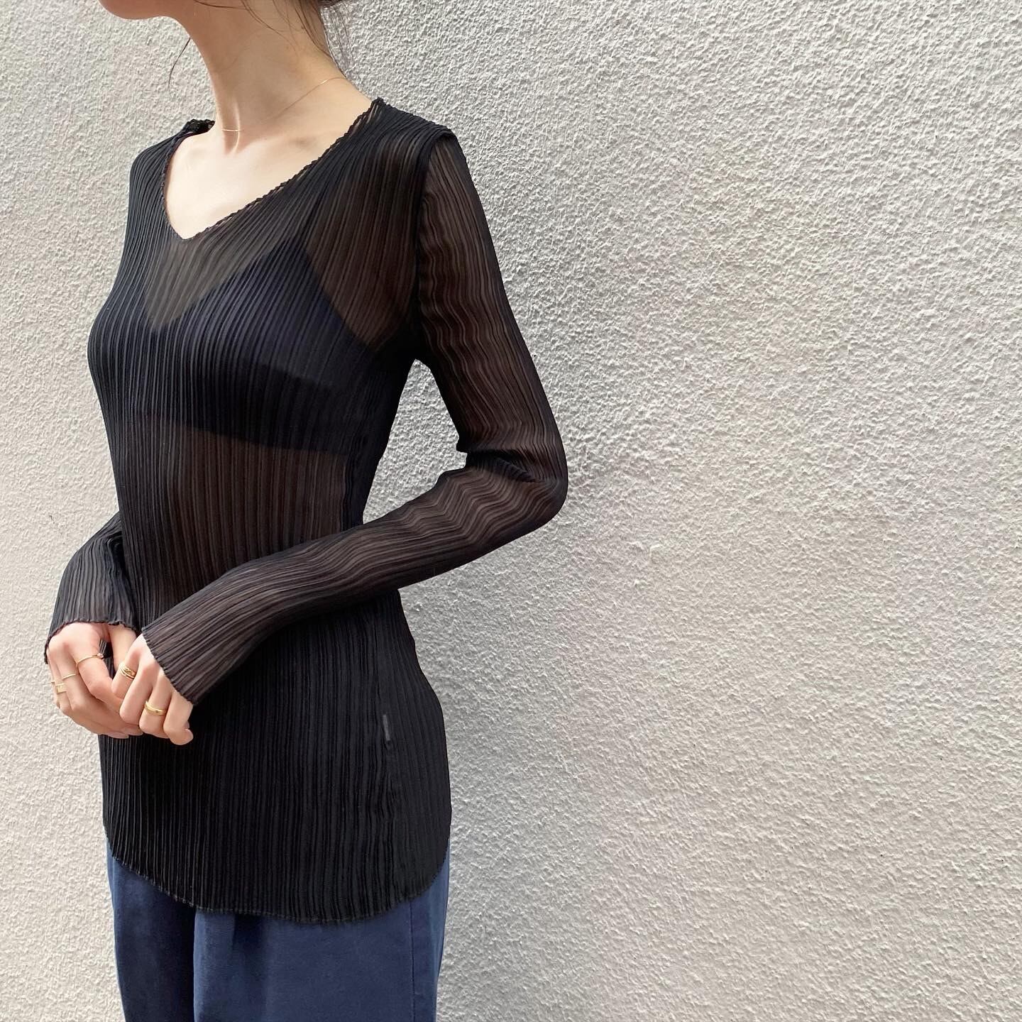 シアー感のあるプリーツ生地がデザイン性のあるトップスです。1枚で着るのはもちろん、キャミワンピとレイヤードしたりジャケット下に仕込んでも素敵です。