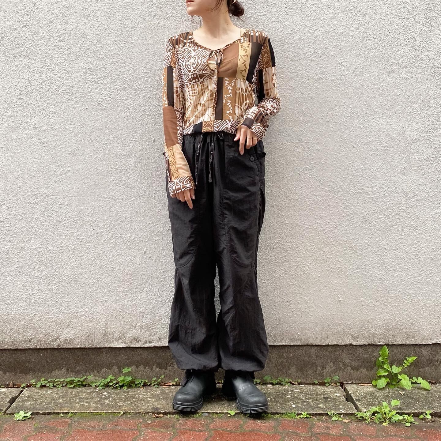 ロング丈やフレアの袖、フロントのリボンが女性らしいシアートップスです。透け感があるため総柄でも肌に馴染み、派手すぎない印象でお召し頂ける1着です。