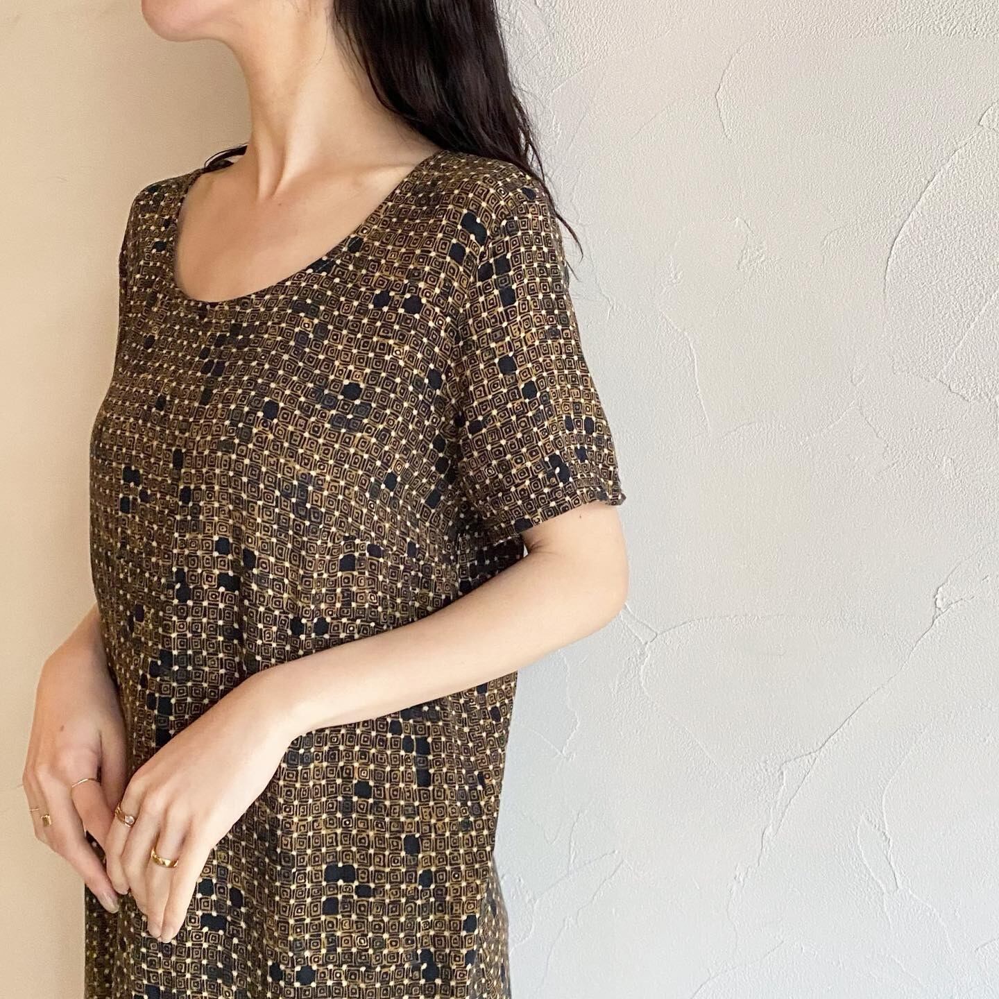 ブラウンベースの落ち着いたトーンのデザインワンピースです。レーヨン100のさらっとした質感が肌触り良く1枚でさらっとお召し頂けます。