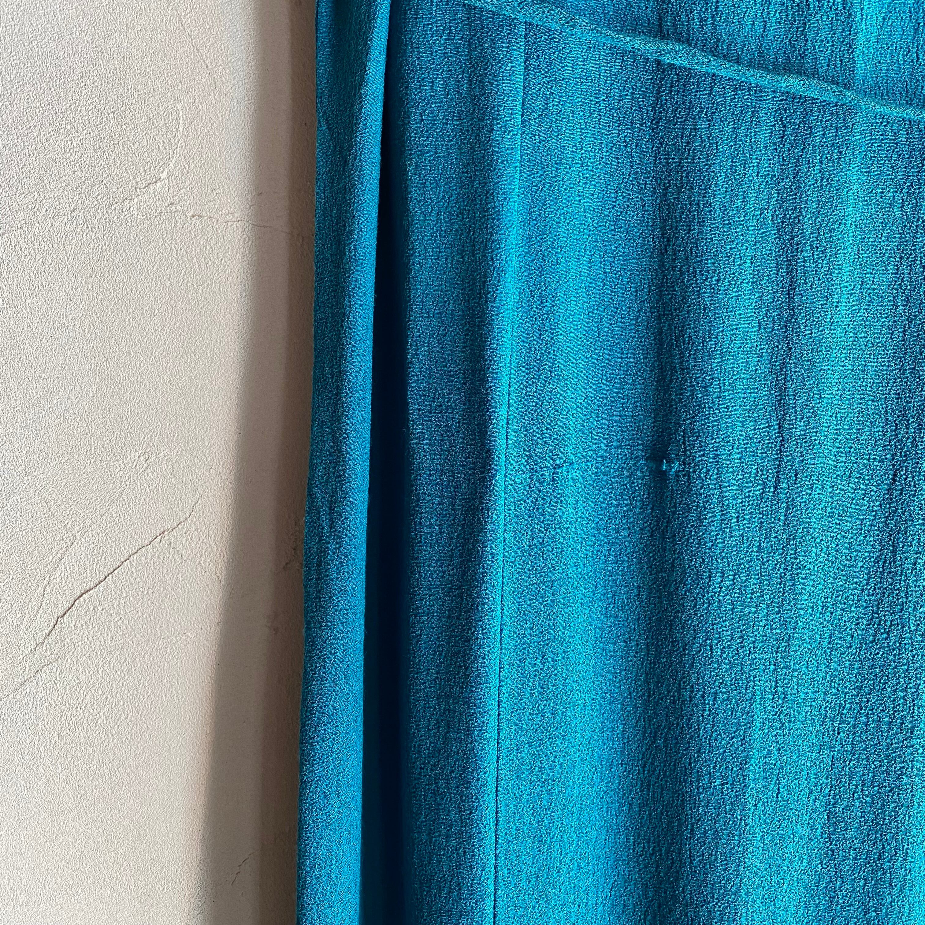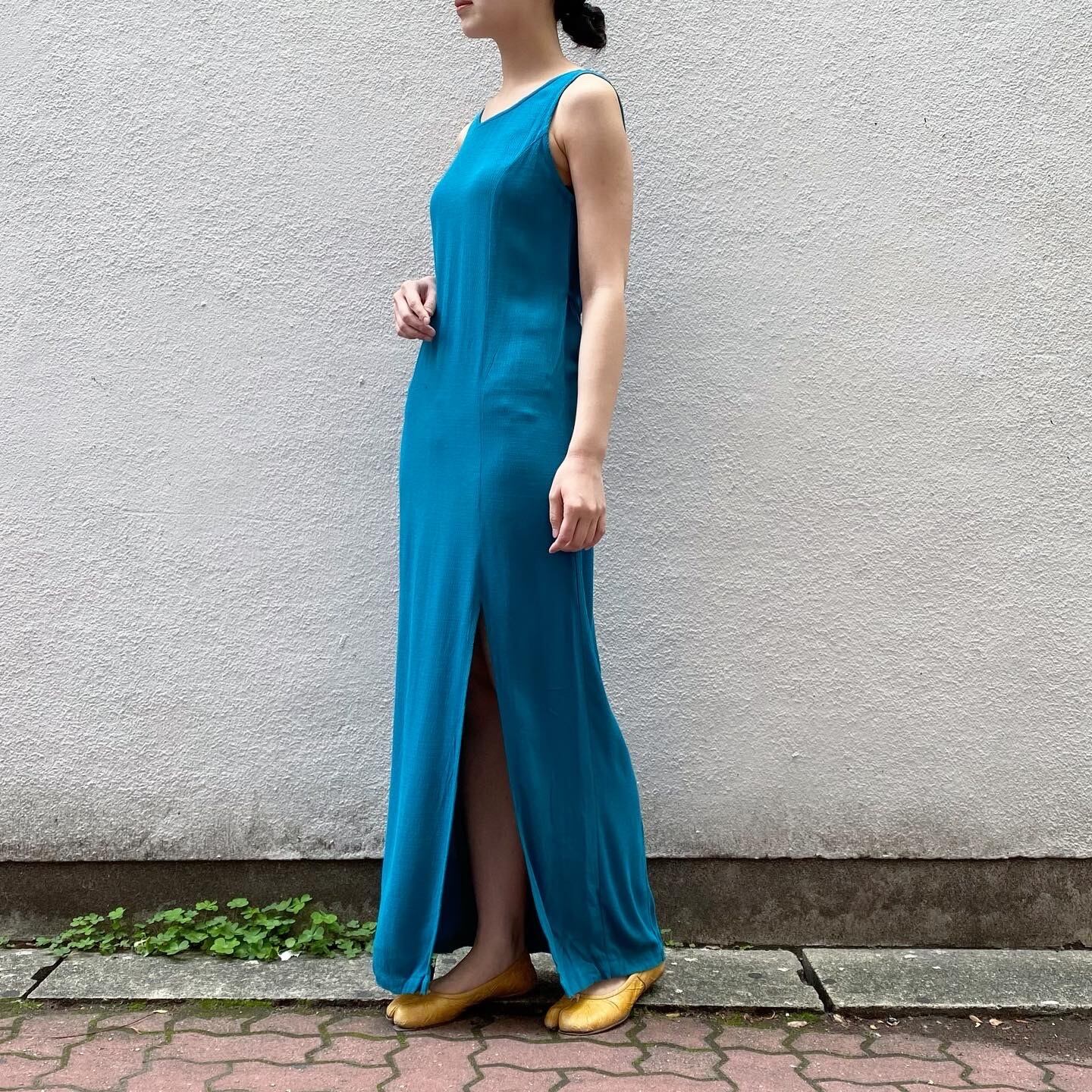 鮮やかなブルーのカラーと大胆なスリットがポイントのワンピースです。ウエストの紐を絞ってシルエットを調節ができます。