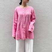 鮮やかなピンクカラー、ゆったりとしたサイズ感が素敵なリネンシャツです。ノーカラーなので首周りがすっきりとしていて夏に活躍しそうな一点です。