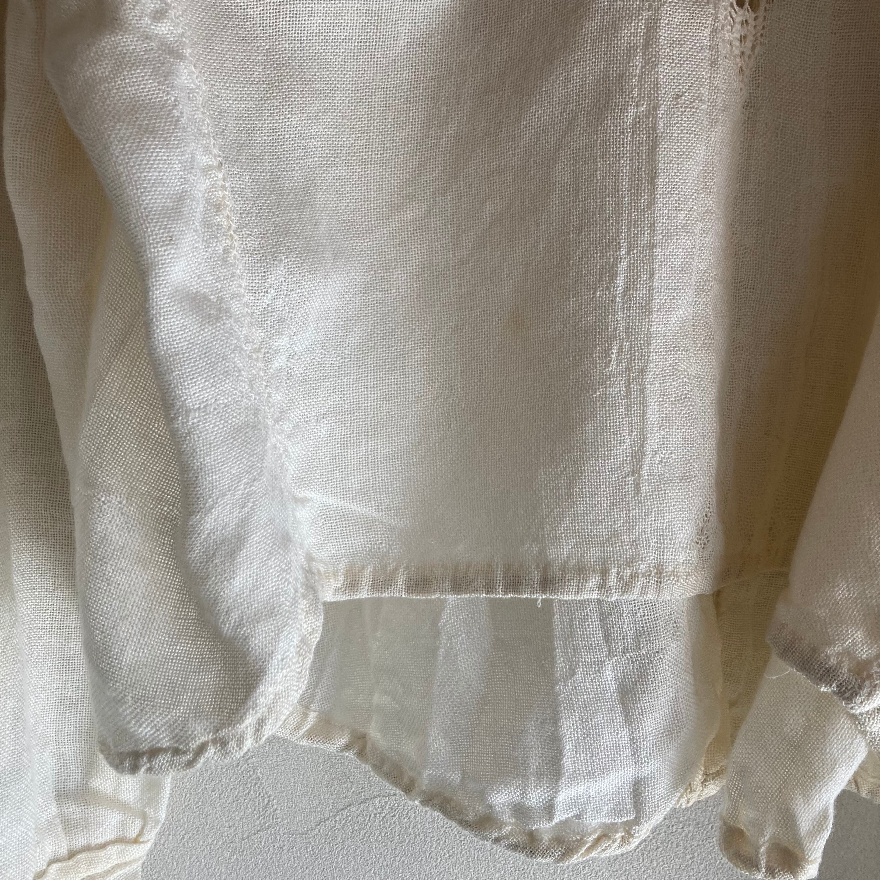 ガーゼのような柔らかい生地感とレースがヴィンテージらしいブラウスです。肌馴染みの良いアイボリーカラーがナチュラルで優しい印象の1着です。