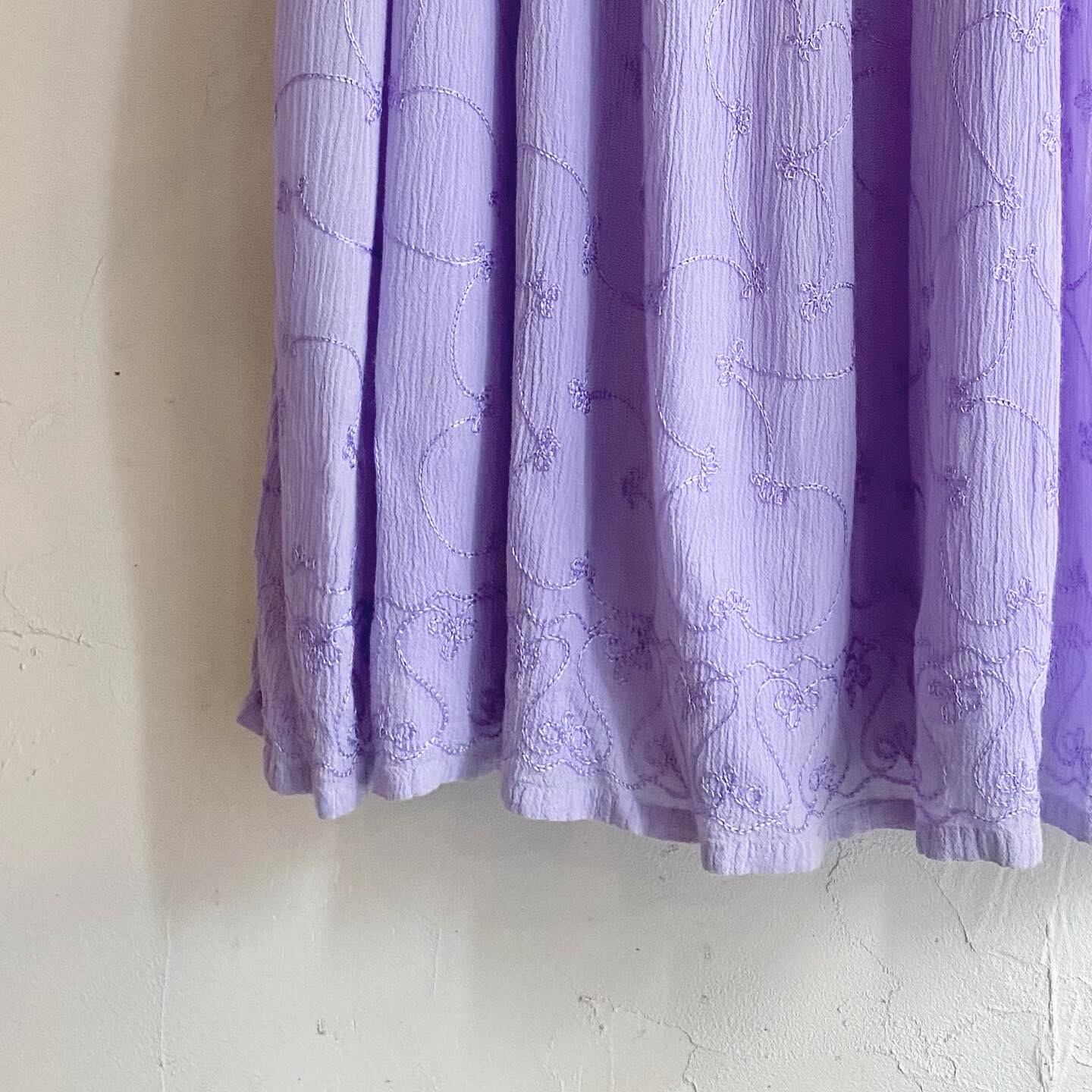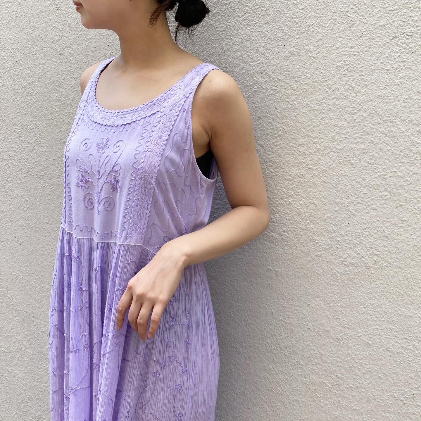 綺麗なラベンダーカラーが印象的な刺繍ワンピースです。鮮やかな刺繍ワンピースは夏に映えて気分を高めてくれる1着です。