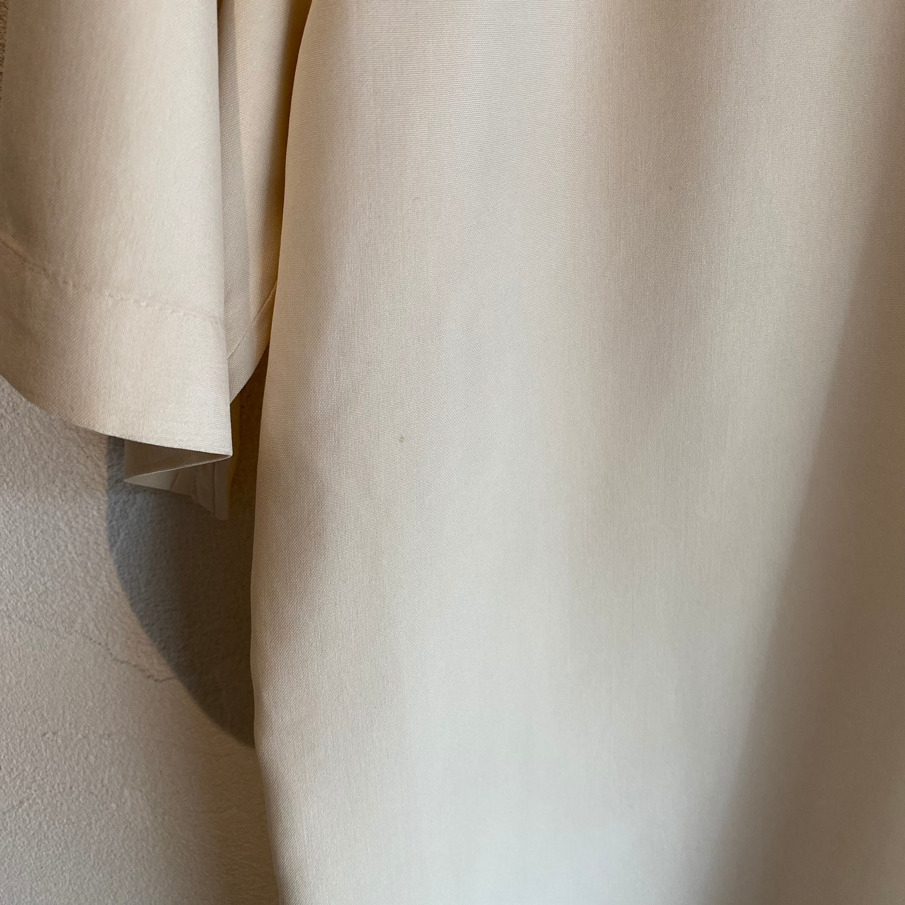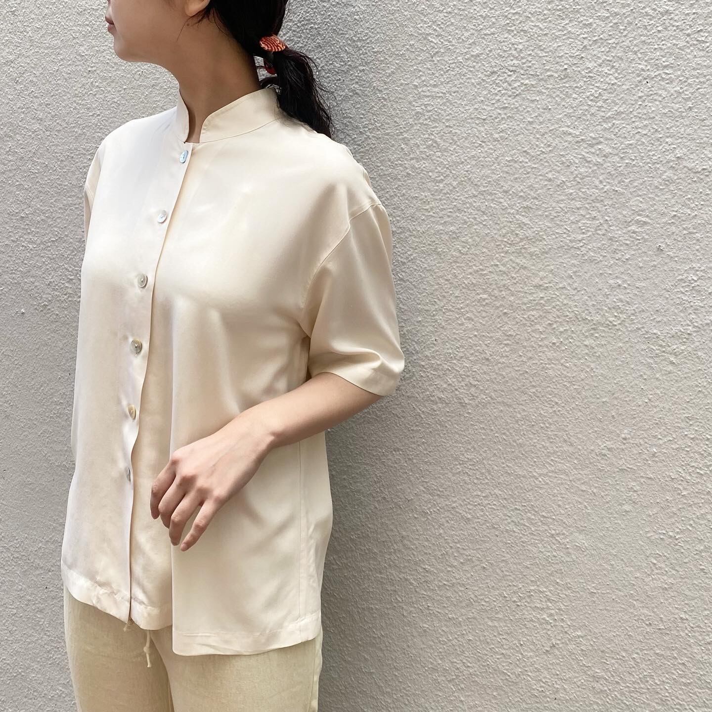 とろみのある生地感と肌馴染みの良いカラーがお洒落な半袖シルクシャツです。スタンドカラーが珍しく、シンプルながら洗練された1着です。