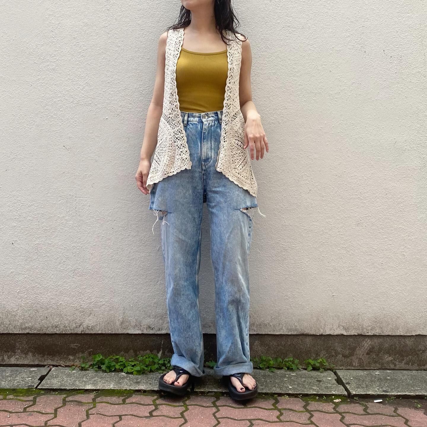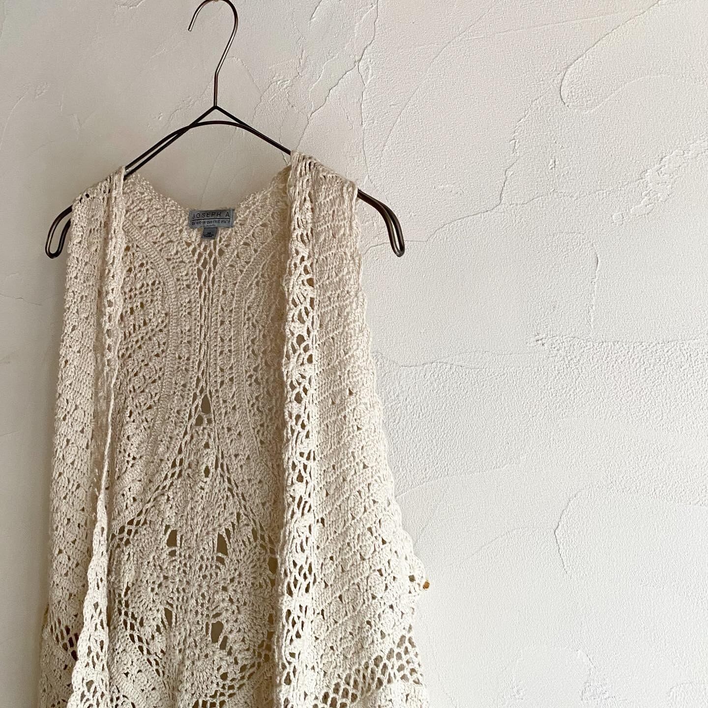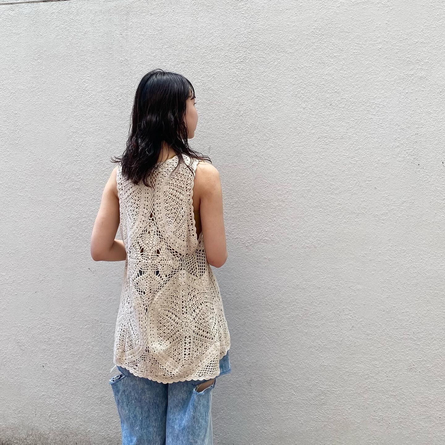 肌馴染みの良い淡いカラーで着回しのしやすいクロシェベストです。キャミソールやtシャツ、無地のワンピース等とレイヤードしてお召し頂けます。