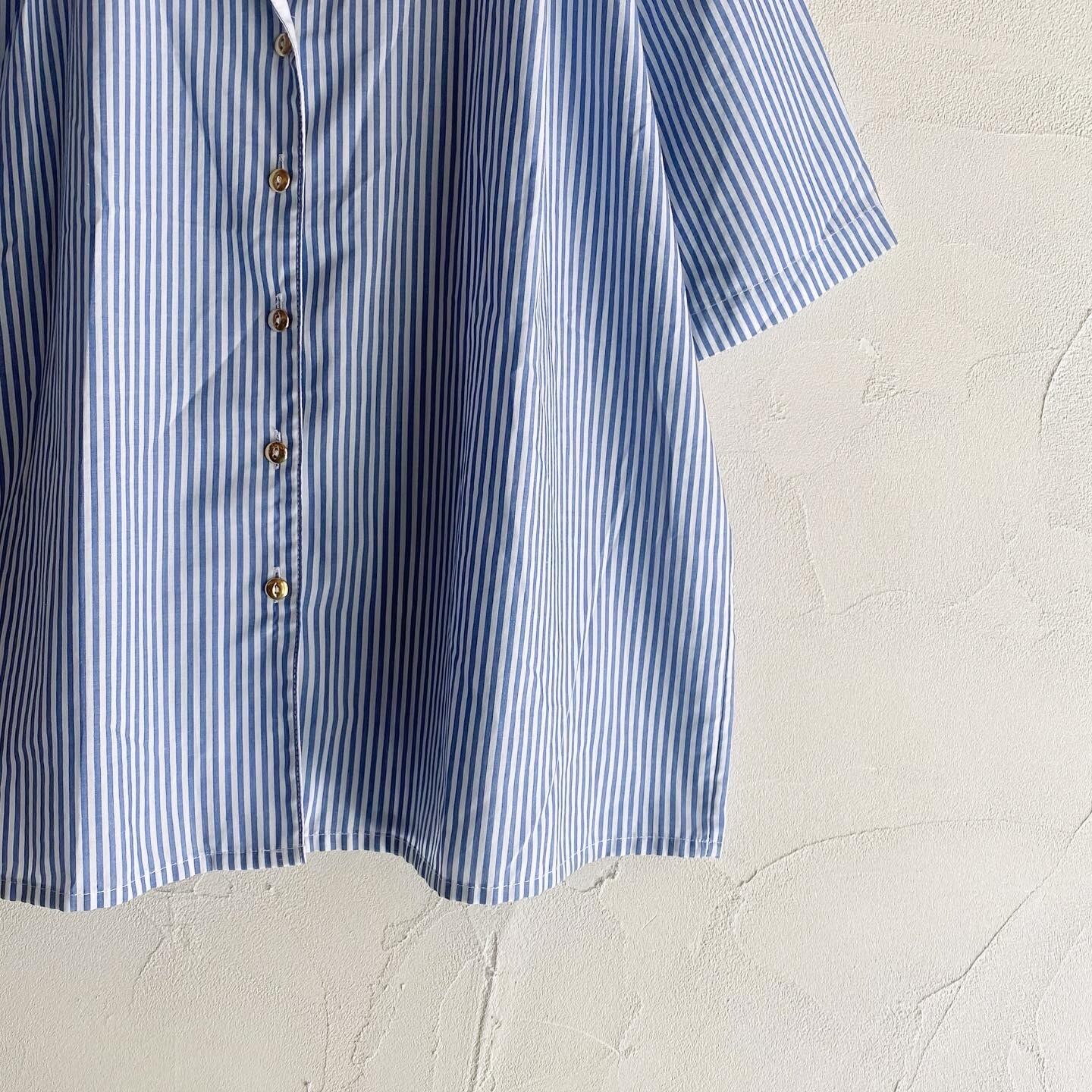 ゴールドボタンが存在感のあるストライプシャツです。くたくたな柔らかい生地感なので、着用した際のシルエットが綺麗な1着です。