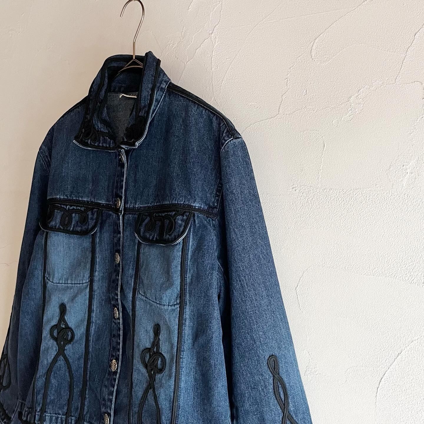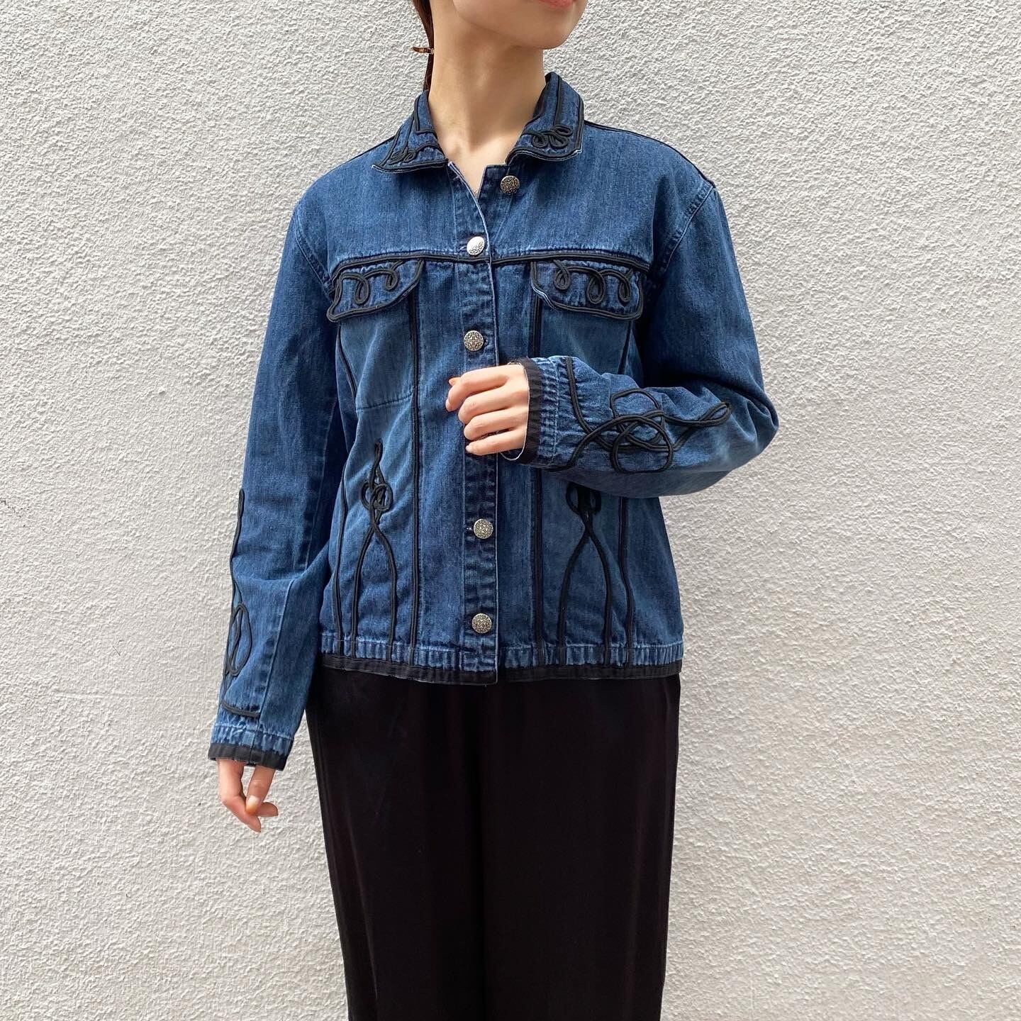 ジャケット全体に黒の刺繍が施された、デザイン性のあるデニムです。