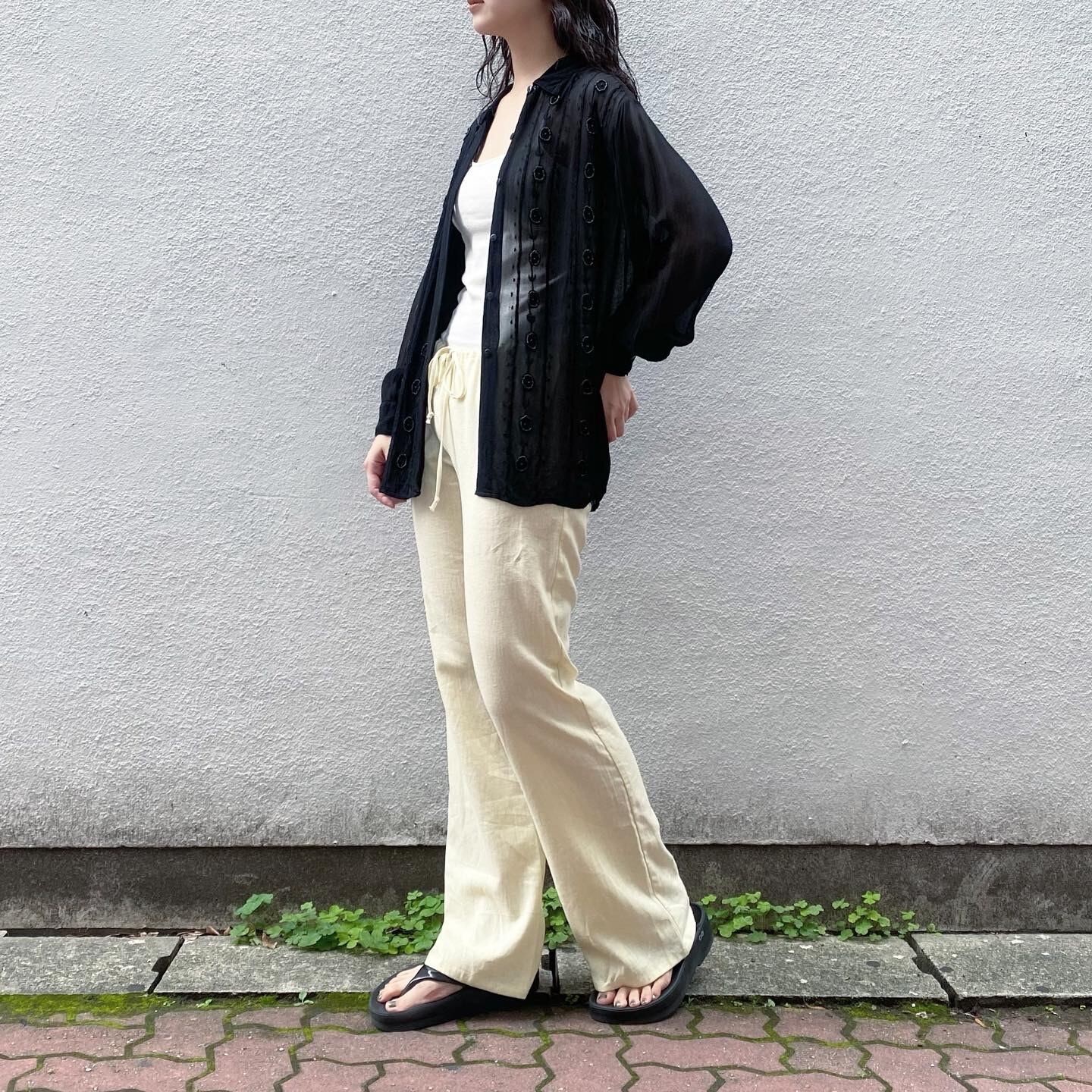 表身頃の繊細な刺繍やビーズのデザインが目を惹くシャツです。透け感もあり夏でも涼しげにお召し頂けます。