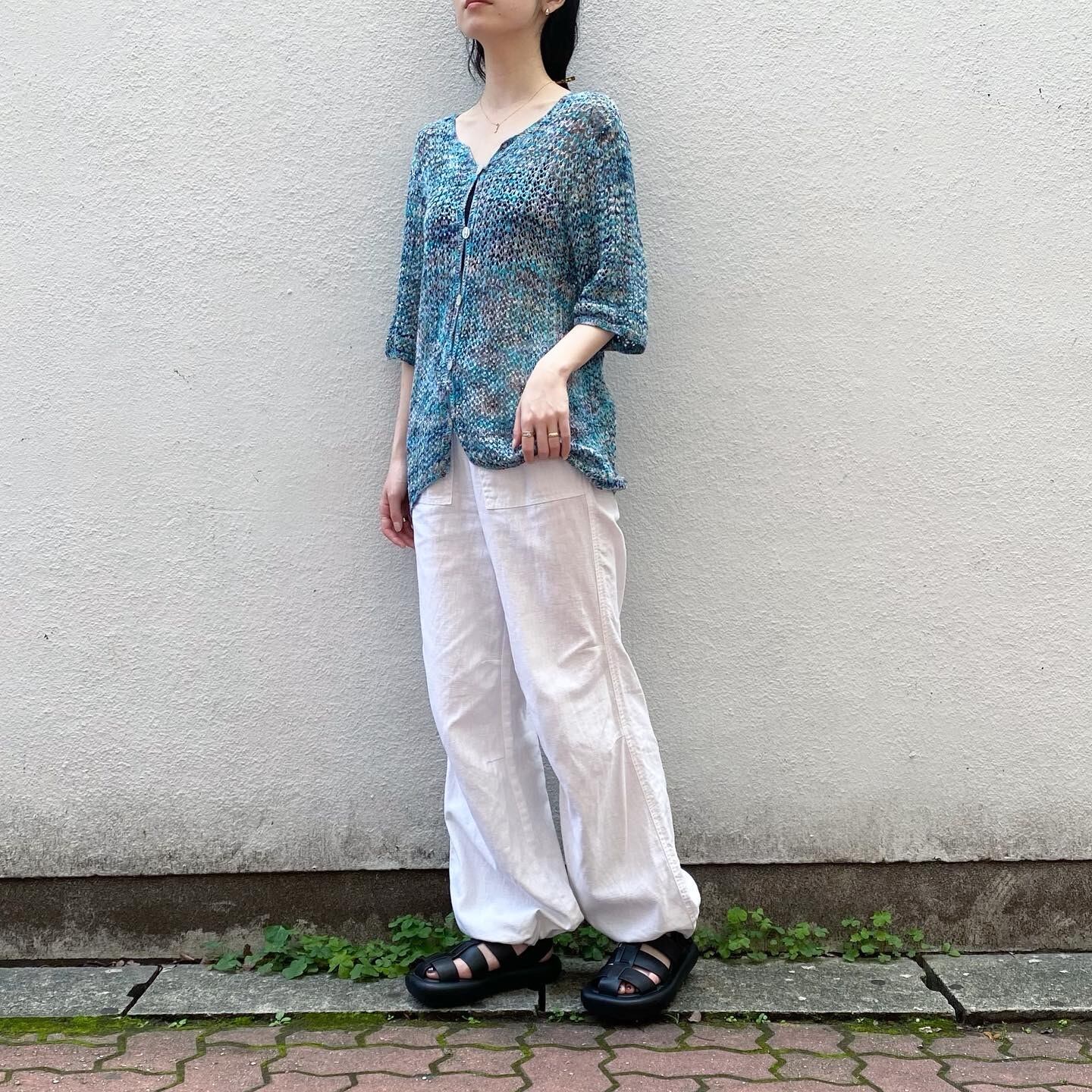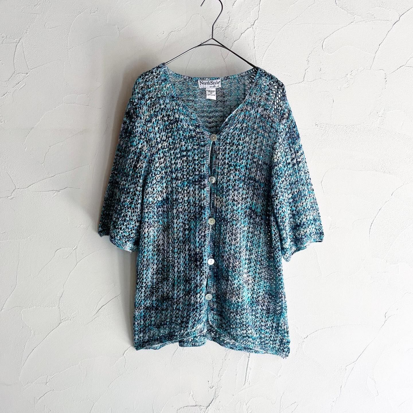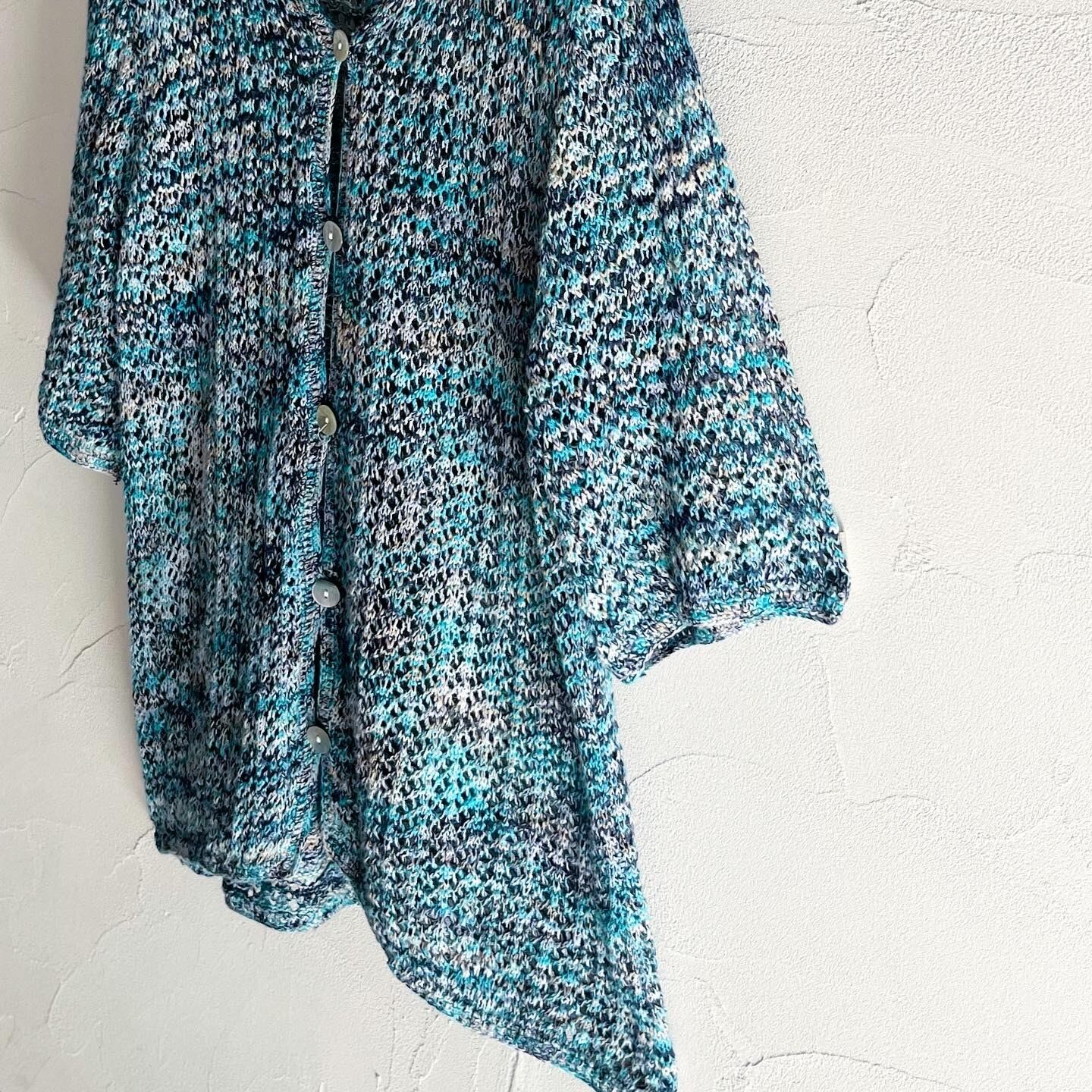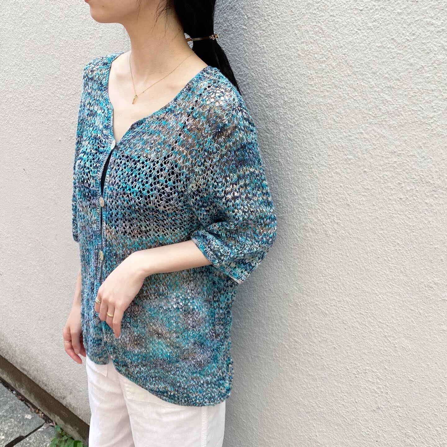 寒色系の色味の糸で編まれている、爽やかな色味のクロシェカーディガンです。