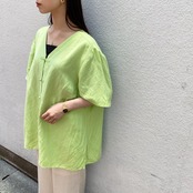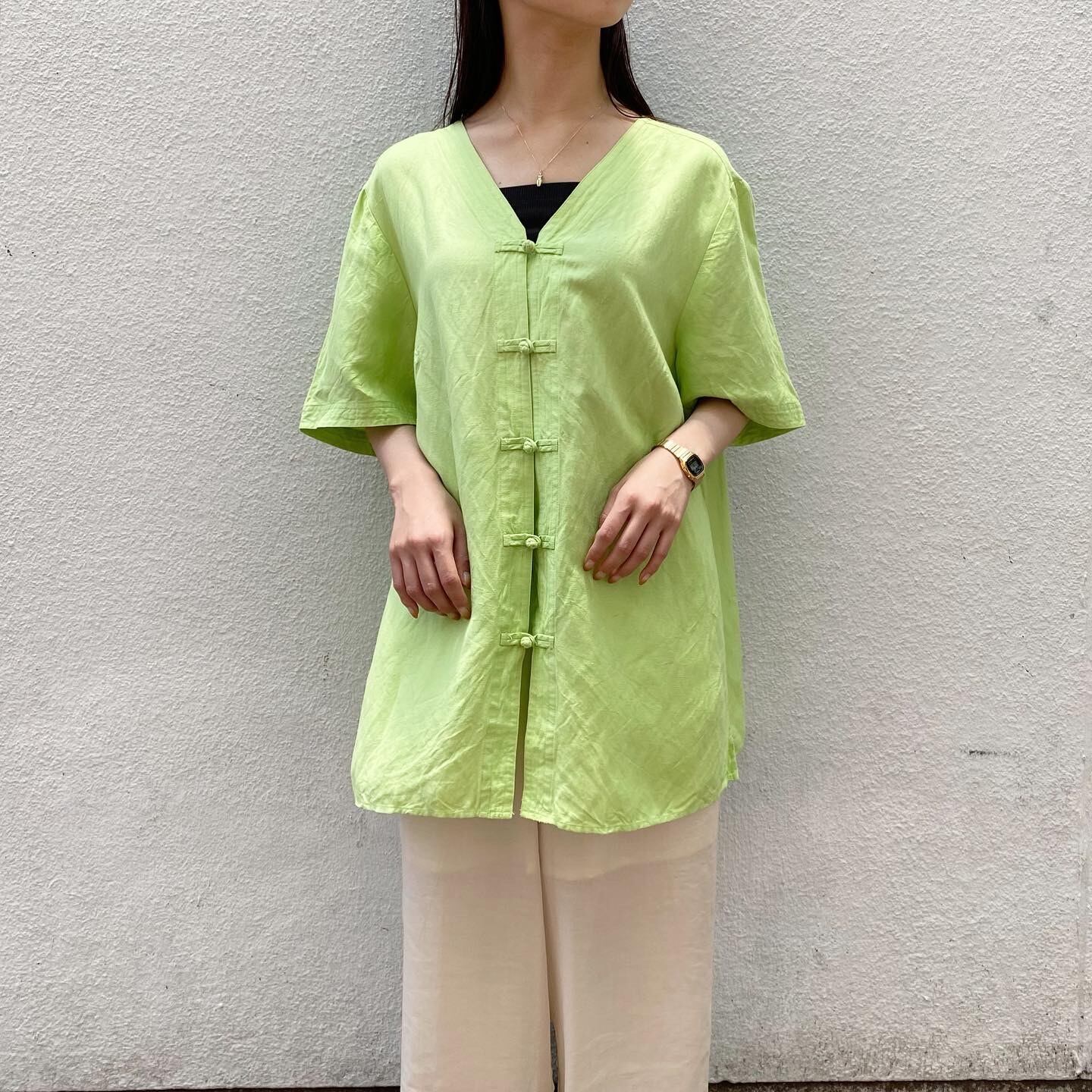 爽やかなグリーンの色味が素敵なリネンシャツです。フロントのチャイナボタンが一癖あり目を惹きます。