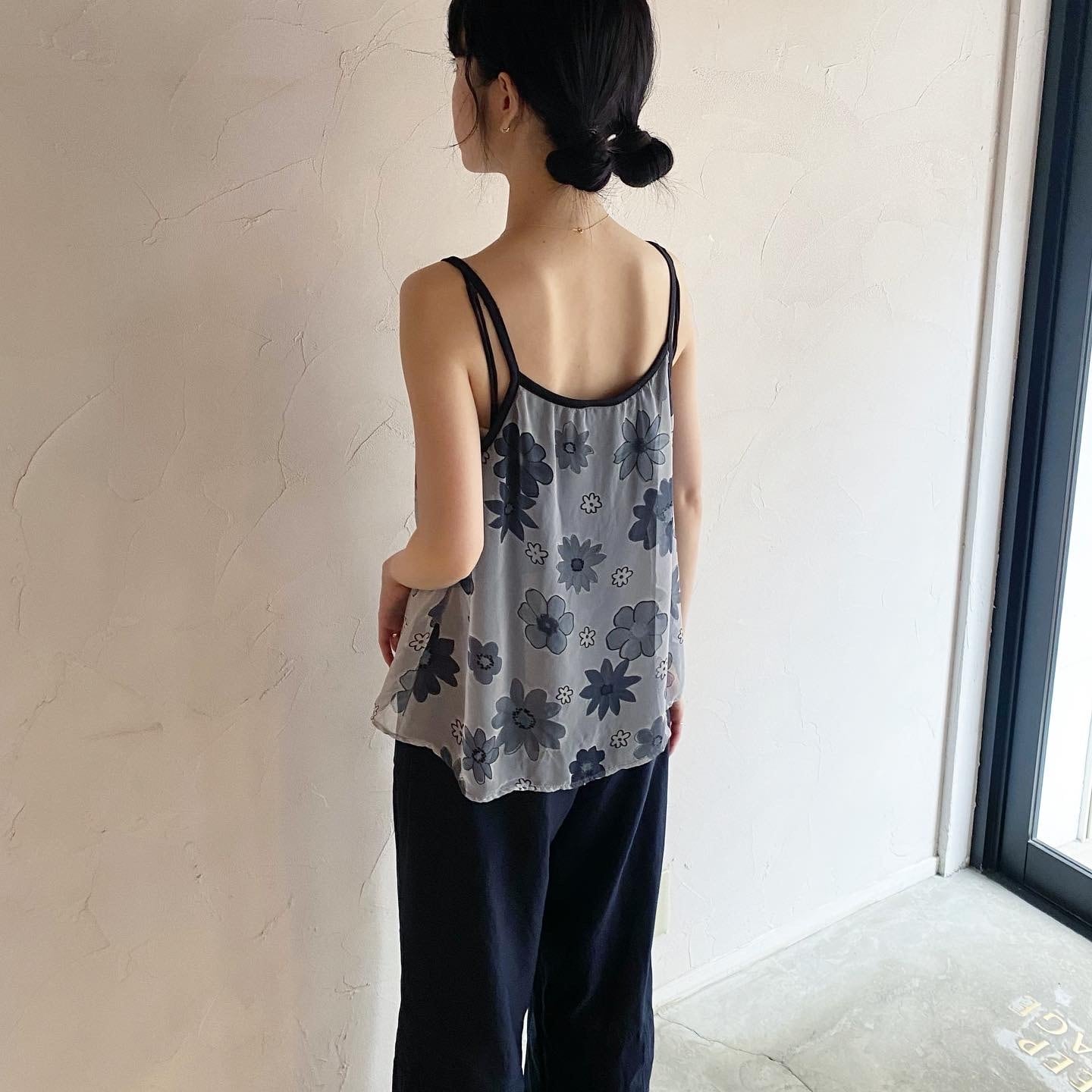 手書きのイラストのような花柄が愛らしい、キャミソールです。裏地がついているので一枚でも、Tシャツなどとレイヤードしてもお召し頂けます。