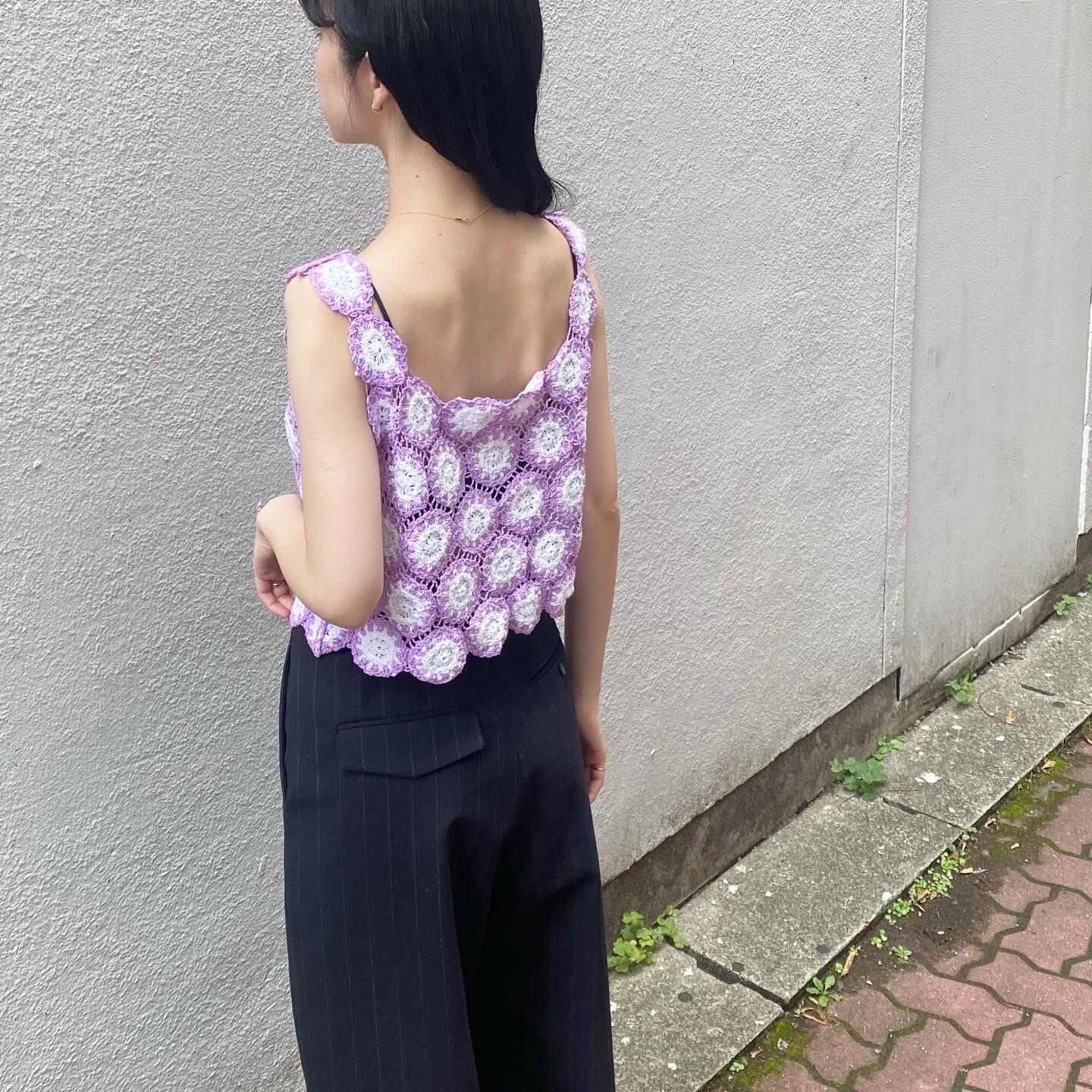丸いクロシェ編みが並んだようなデザインが可愛いトップス。パープルもクロシェ編みになるとこんなにヘルシーな雰囲気に。短めの丈でハイウエストボトムともよく合います。
