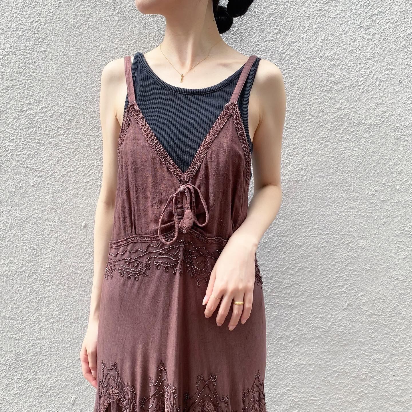 ビーズや刺繍、リボンの装飾が素敵なワンピースです。落ち着いたトーンのカラーで派手すぎず、キャミソールタイプなのでインナー次第で雰囲気を変えてお召し頂けます。