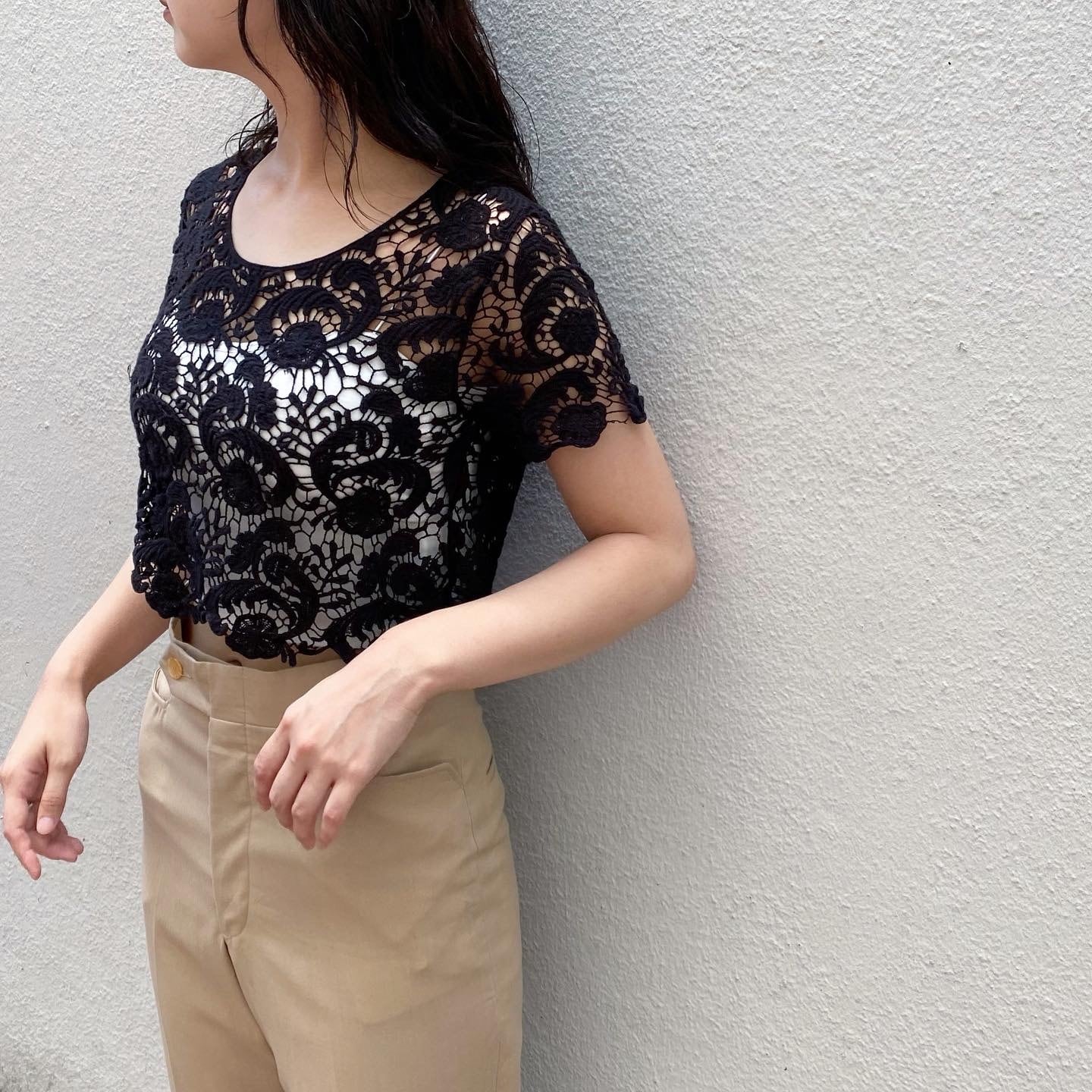 クロップド丈がボトムスとのバランスが取りやすいクロシェトップスです。首周りの空きが程よく抜け感があります。