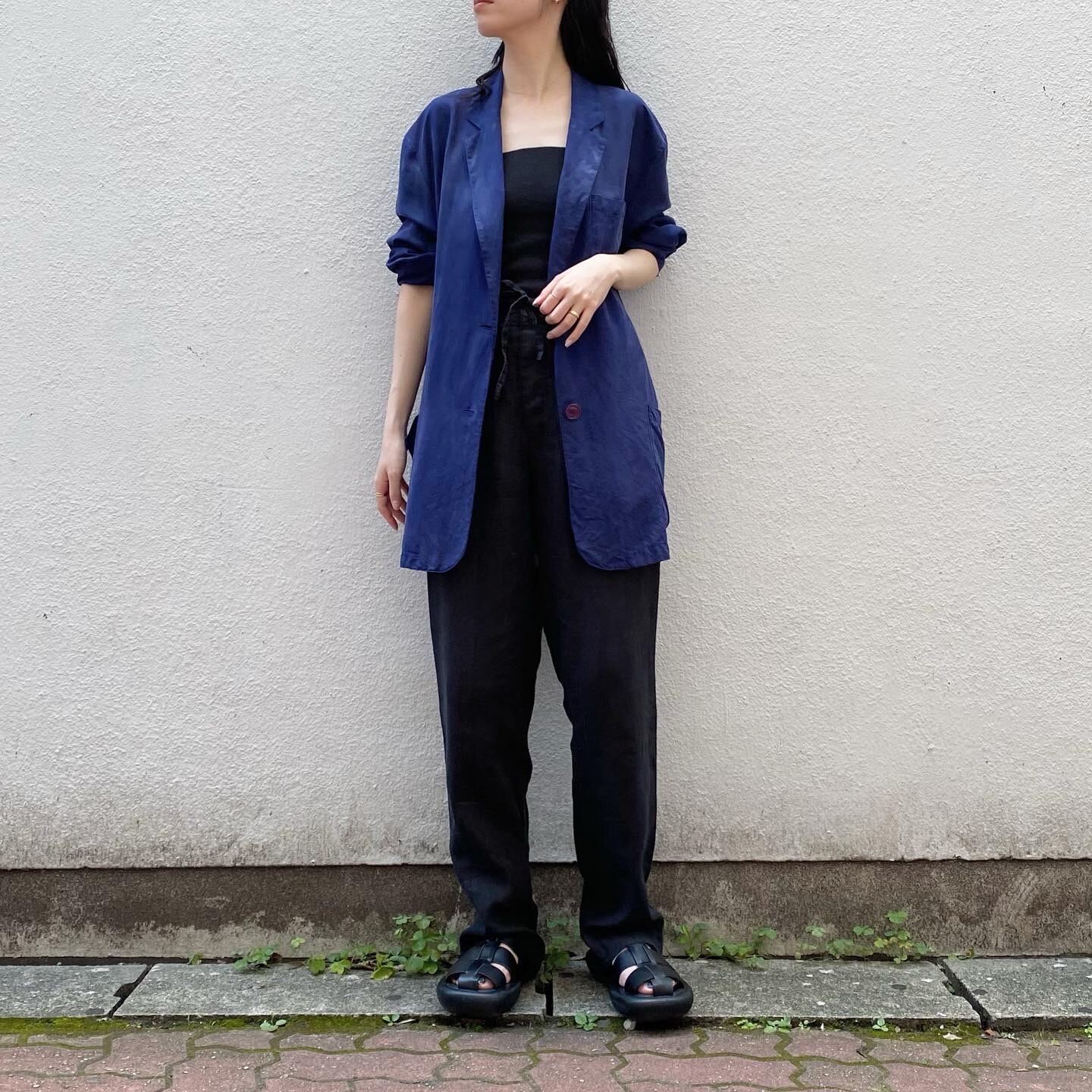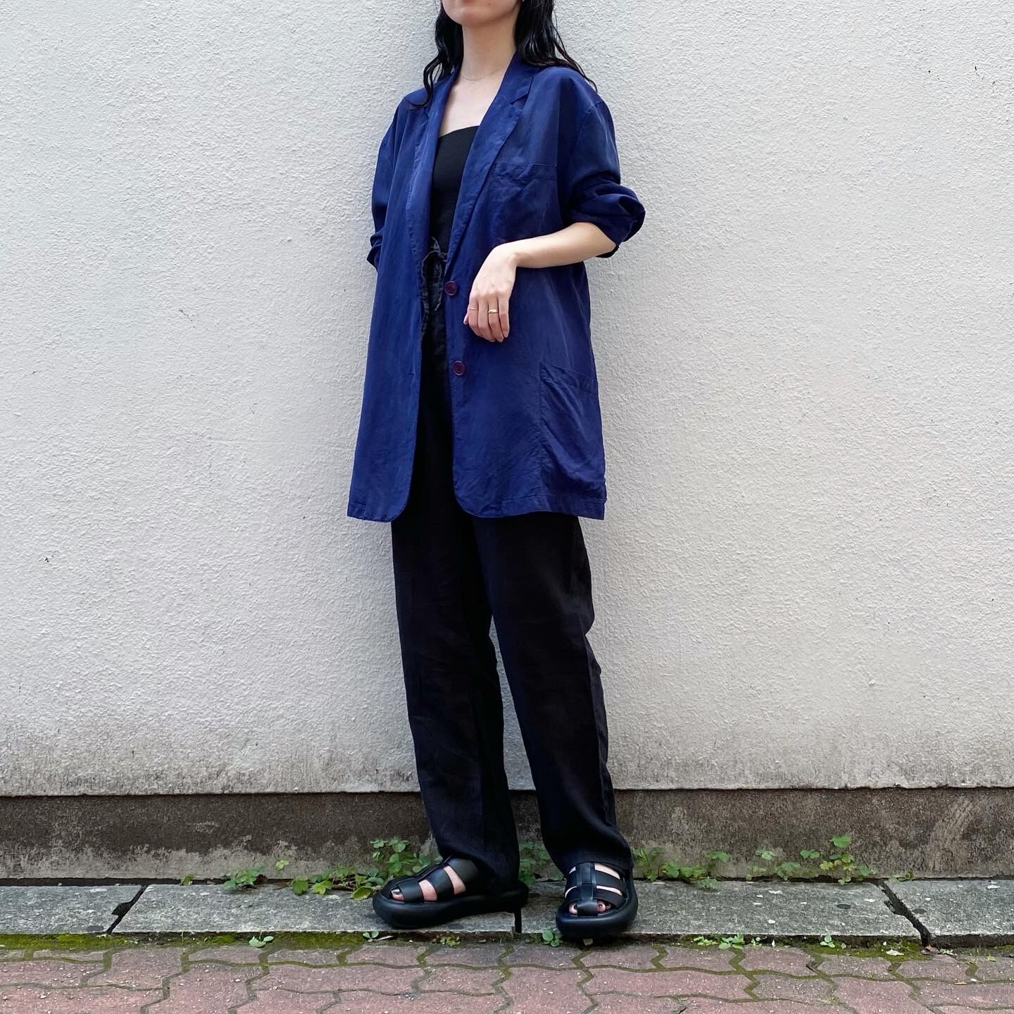 深みのあるネイビーの色味が素敵なテーラードジャケットです。シルク100%なので着心地が良く、さらっとお召し頂けます。