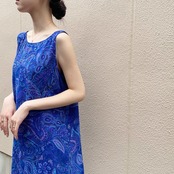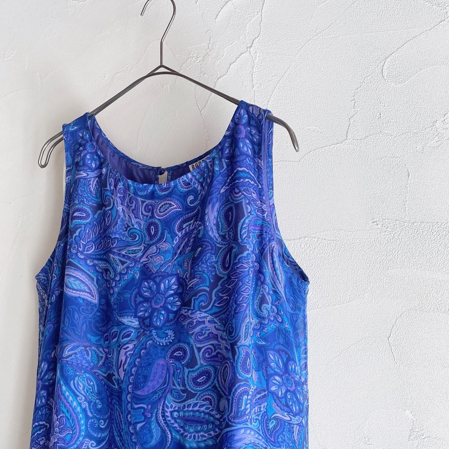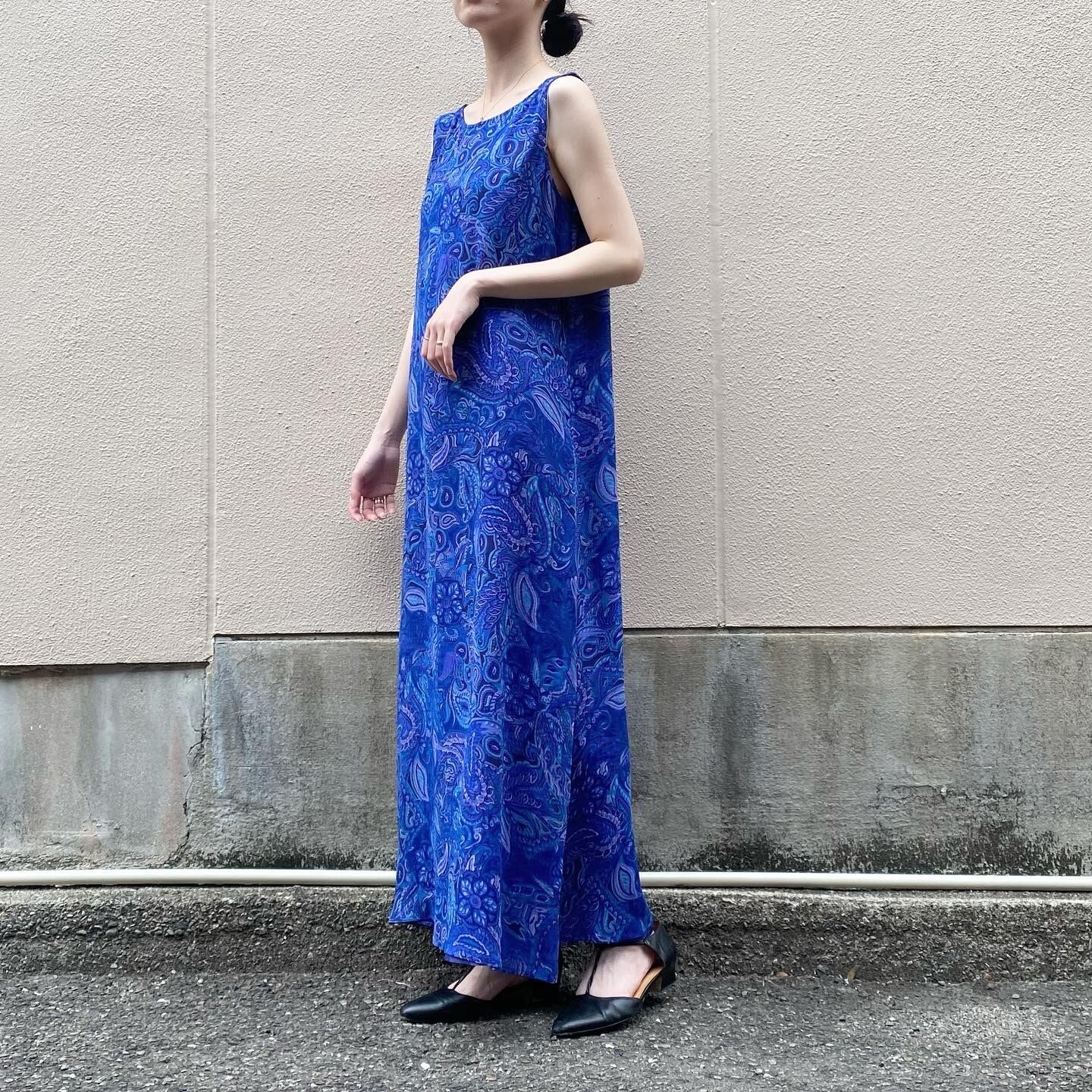 目が醒めるようなブルーが素敵なペイズリー柄のワンピースです。100%silk素材なのでとても軽い着心地です。