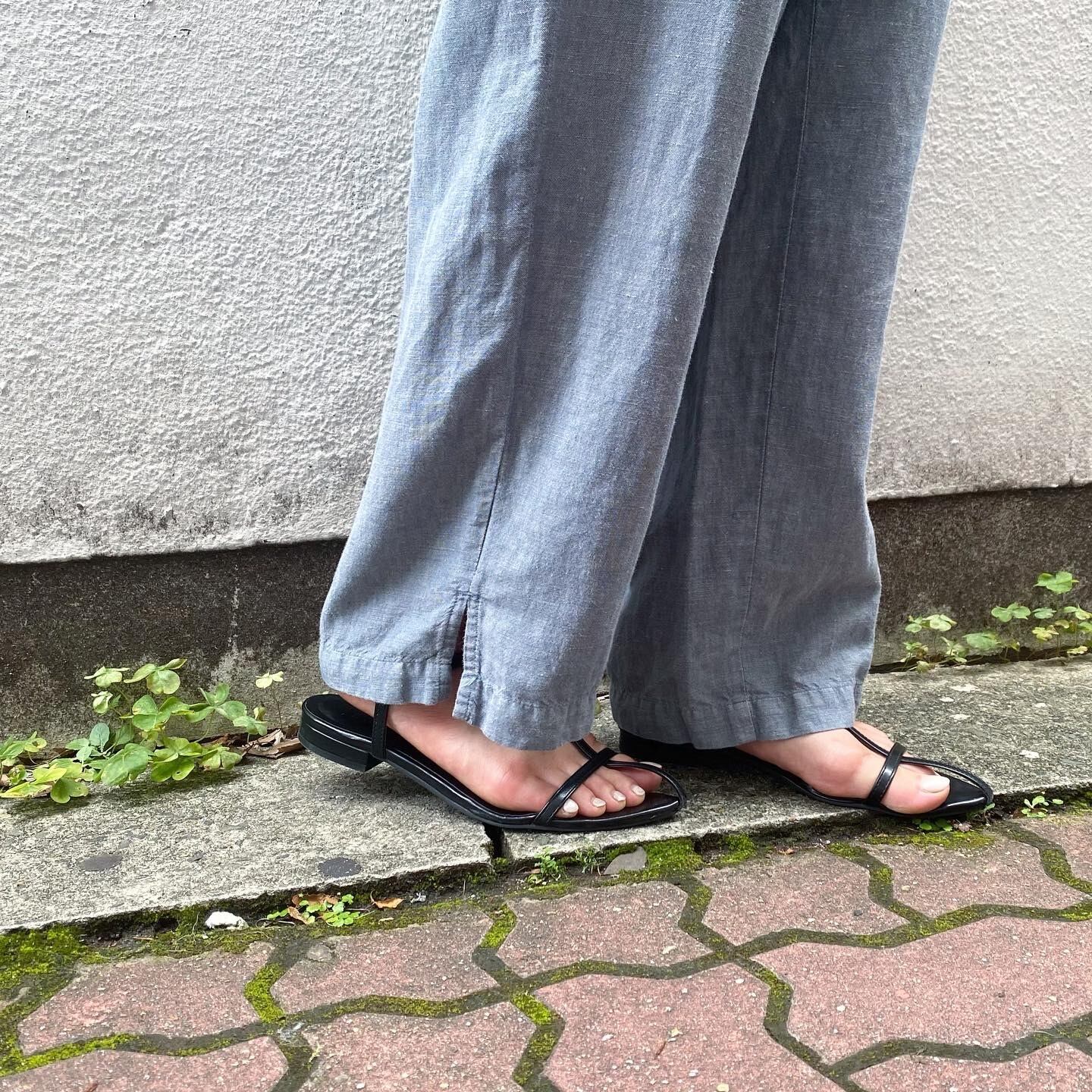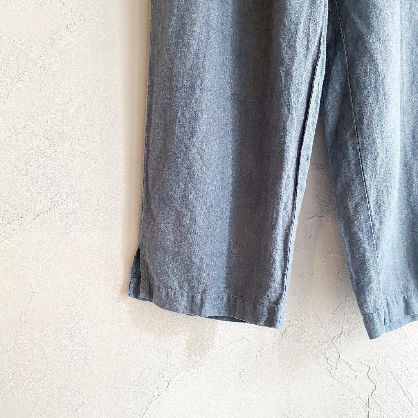 絶妙なグレーの色味が素敵なリネンパンツです。ウエストがゴムになっており、裾幅も広めなので、ゆったりお召し頂けます。