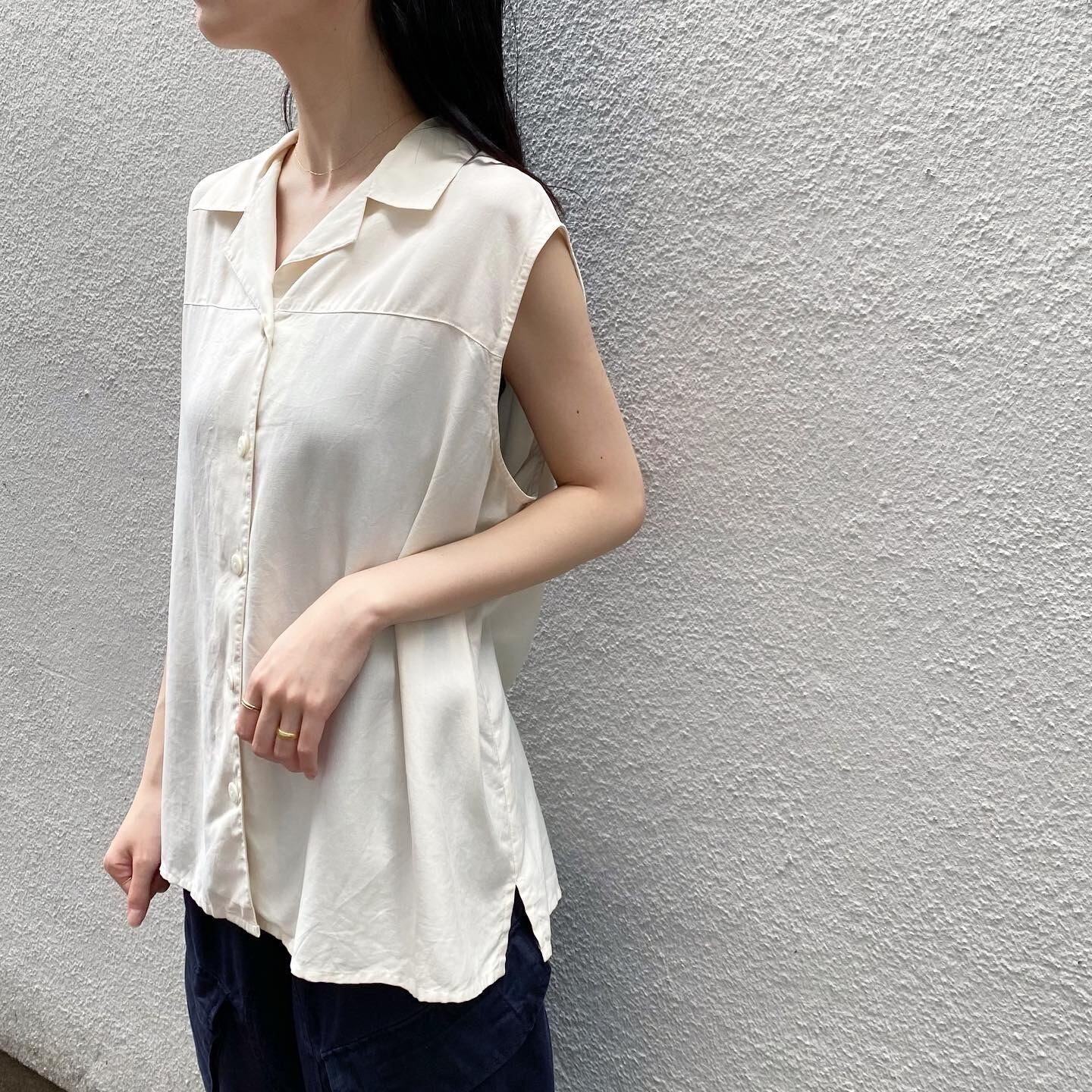セミマットよりのシルク生地で品のあるノースリーブシャツです。ボタンを閉めて1枚で着るのはもちろん、開けてベストのようにもご着用頂けます。
