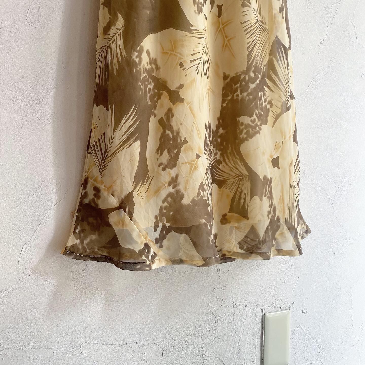 リーフなどのボタニカルなパターンがお洒落なフレアワンピースです。シアーな生地が2枚重なっており、動きのあるシルエットが素敵です。