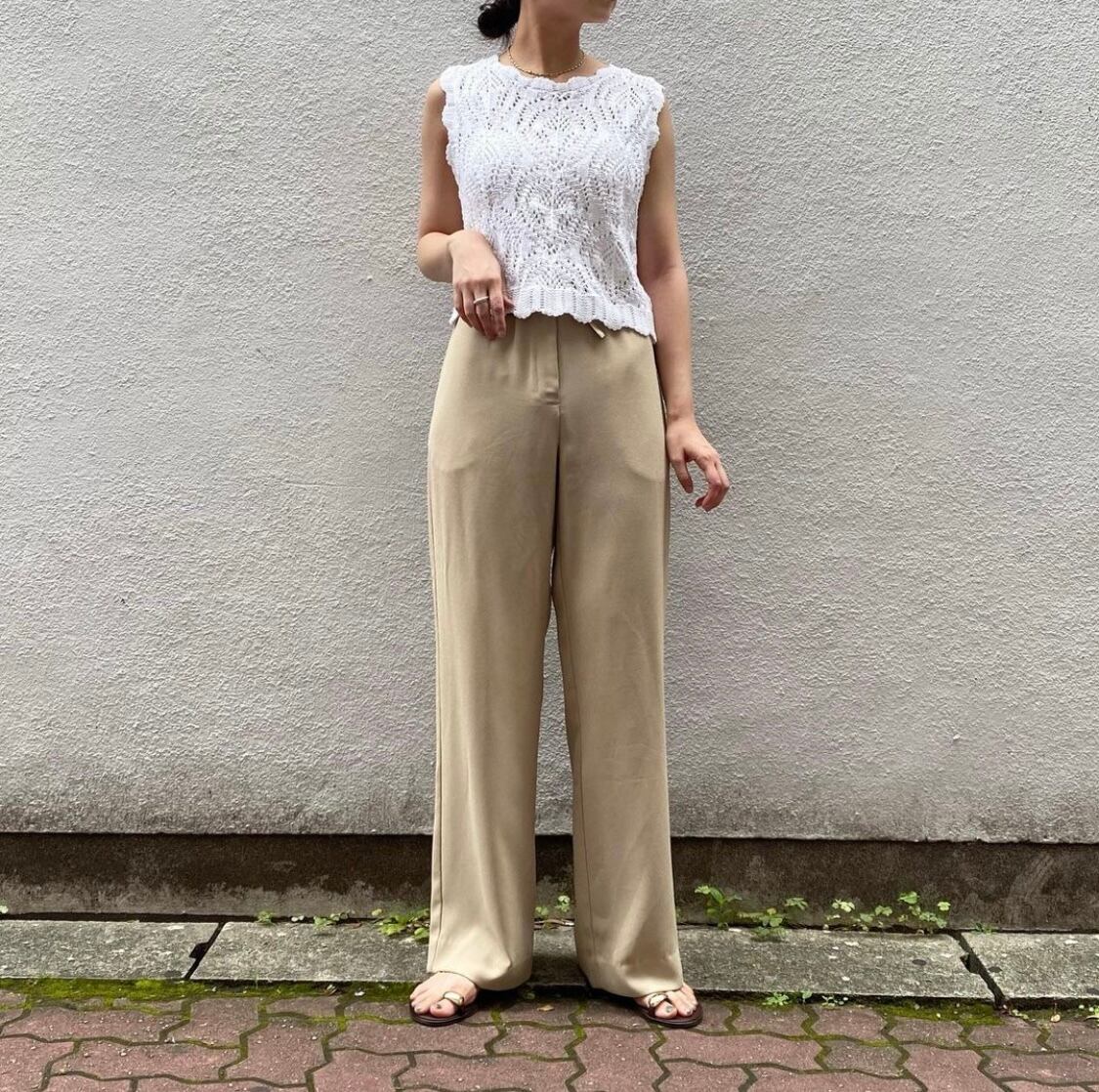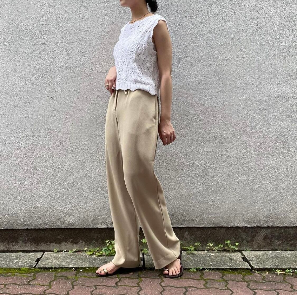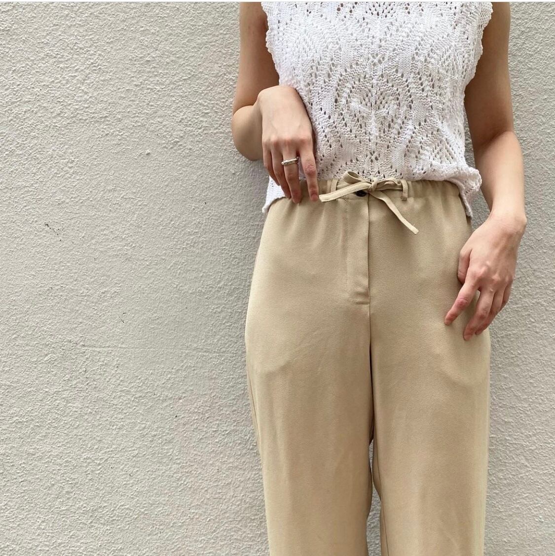 ややグリーンがかったベージュのお色味が素敵なイージーパンツです。ウエストは紐で調節できるので楽にお召し頂けます。