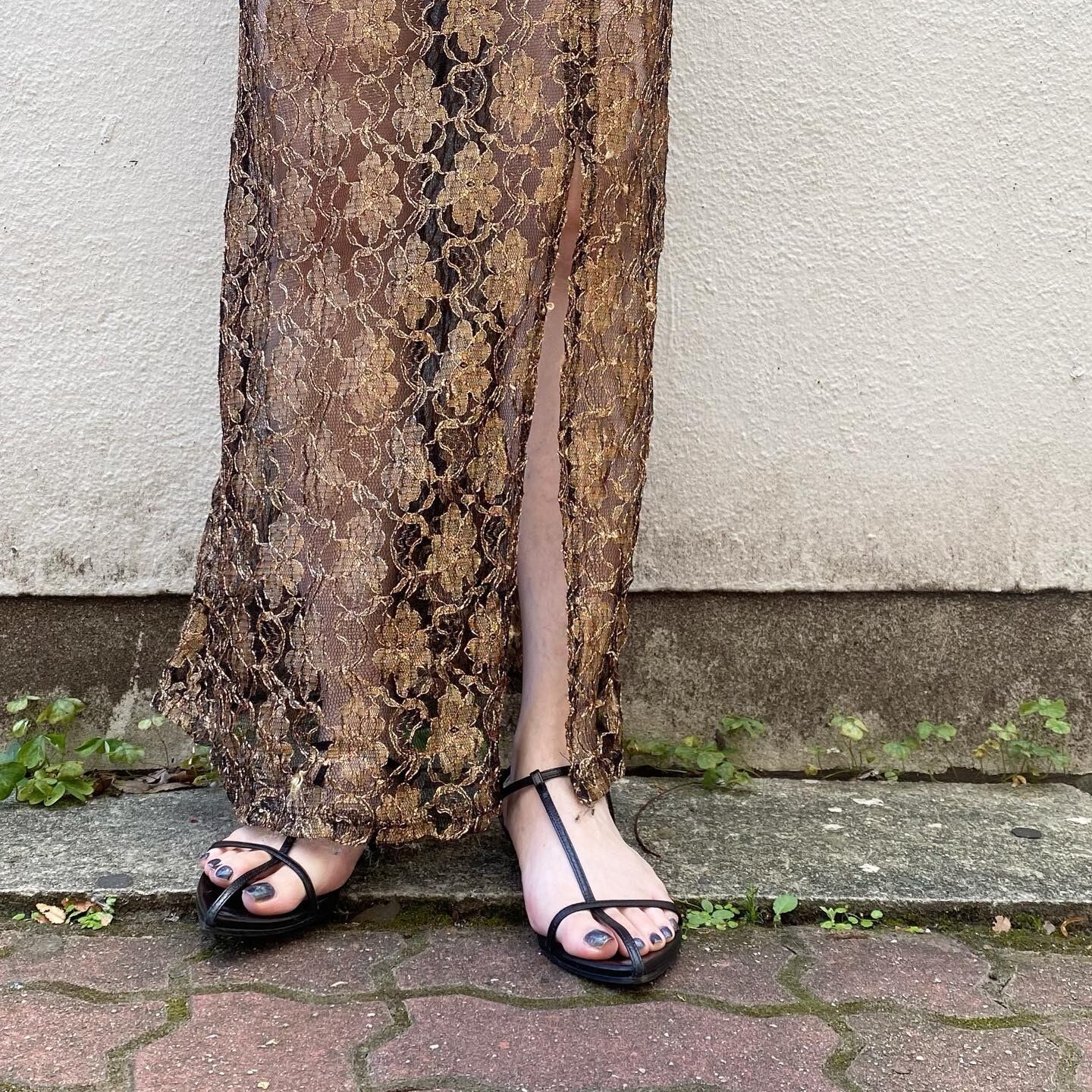黒地に光沢のあるオレンジのレースが目を惹くワンピースです。薄めのパットがついているので、ワンピース一枚でもお召し頂けます。