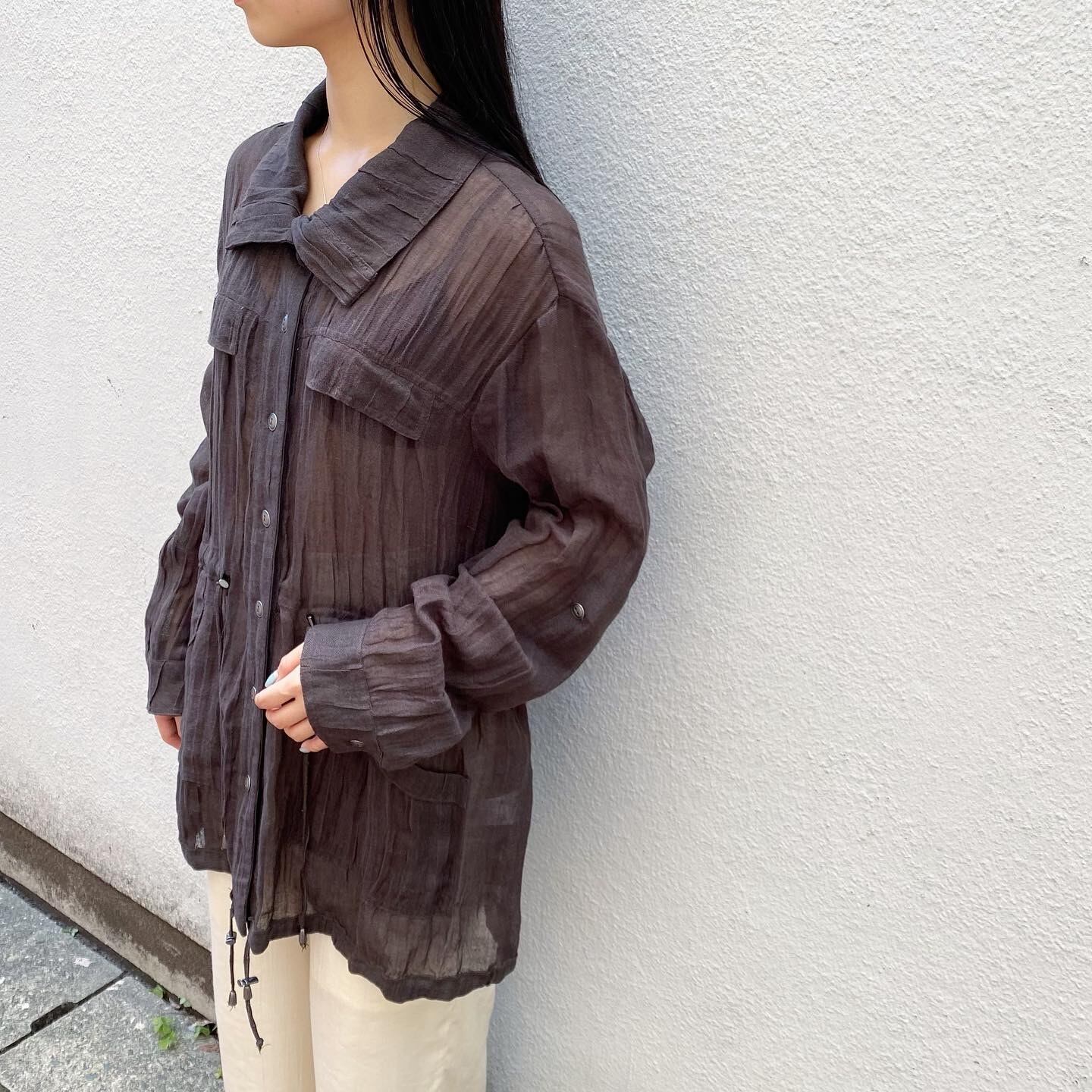 深いブラウンの色味が素敵なデザインシアージャケットです。ドローコードでシルエットを変えてお召し頂けます。