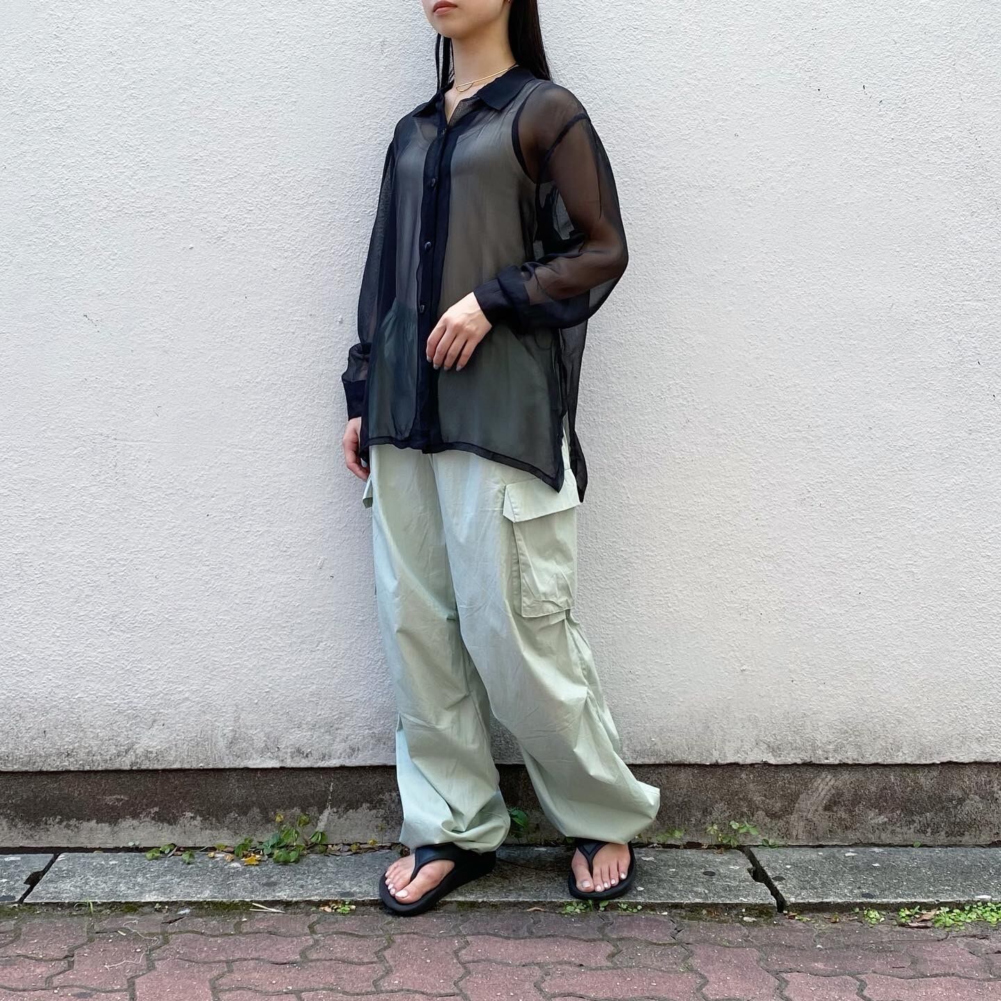 透け感が涼しげなシアーシャツです。デニムやスカートなどどんなボトムスとも相性の良いデザインです。
