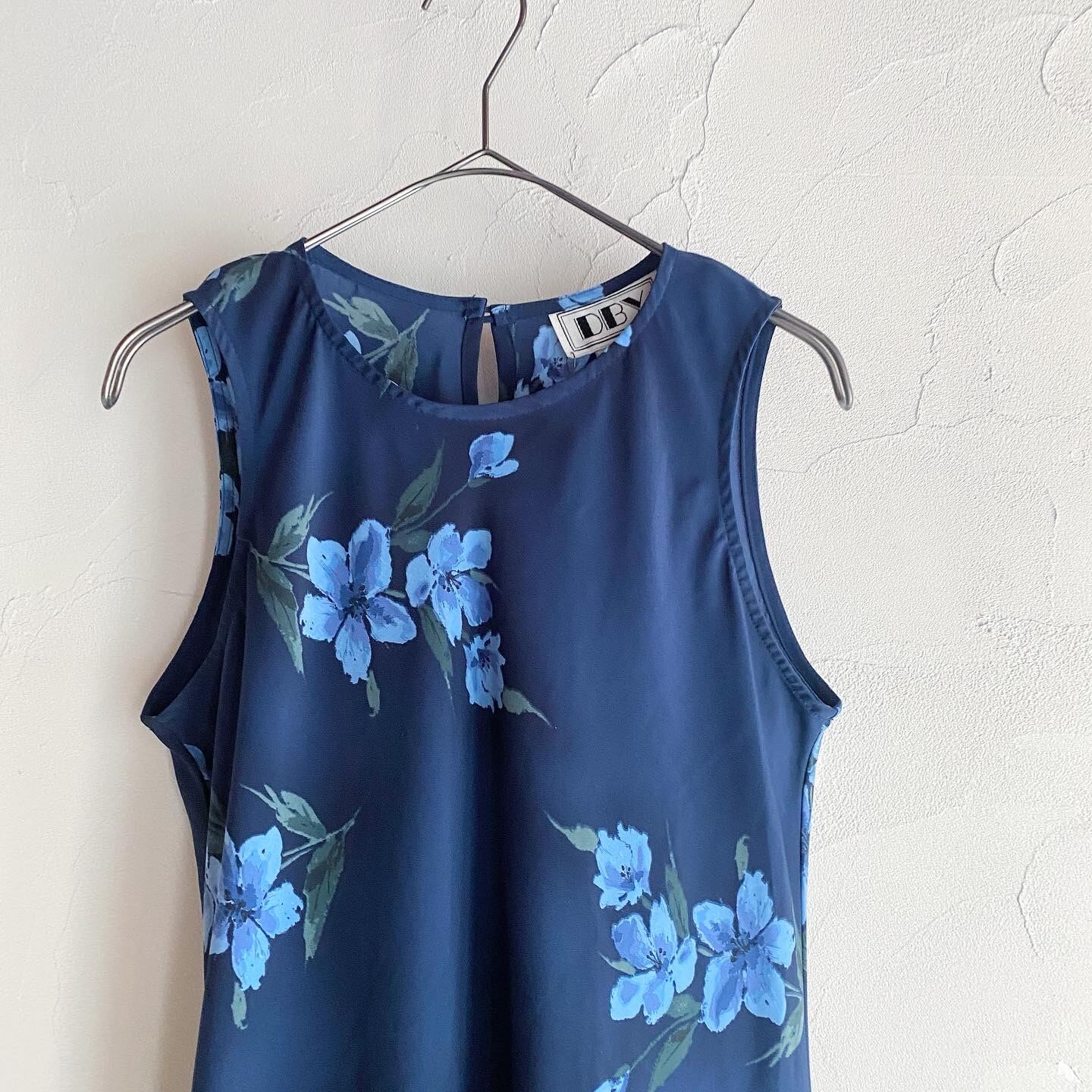 ブルーの花柄が大人っぽさを感じるワンピースです。ややアメスリな肩のラインがとても綺麗です。