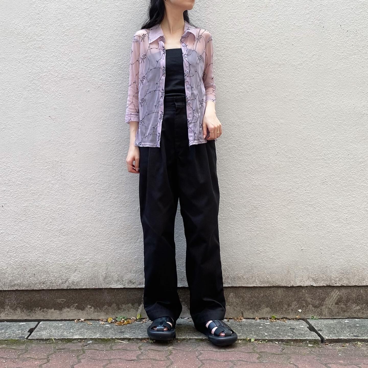 ラメ糸が混ざった刺繍が美しいシアーシャツです。コンパクトなシルエットで、さらっとお召し頂けます。