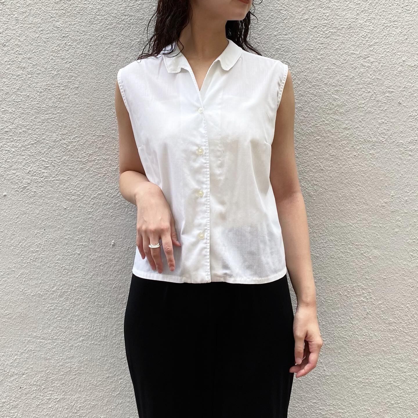 さらっとした柔らかな生地感のノースリーブシャツです。身幅広めなので身体のラインを拾わず、涼しくお召し頂けます。