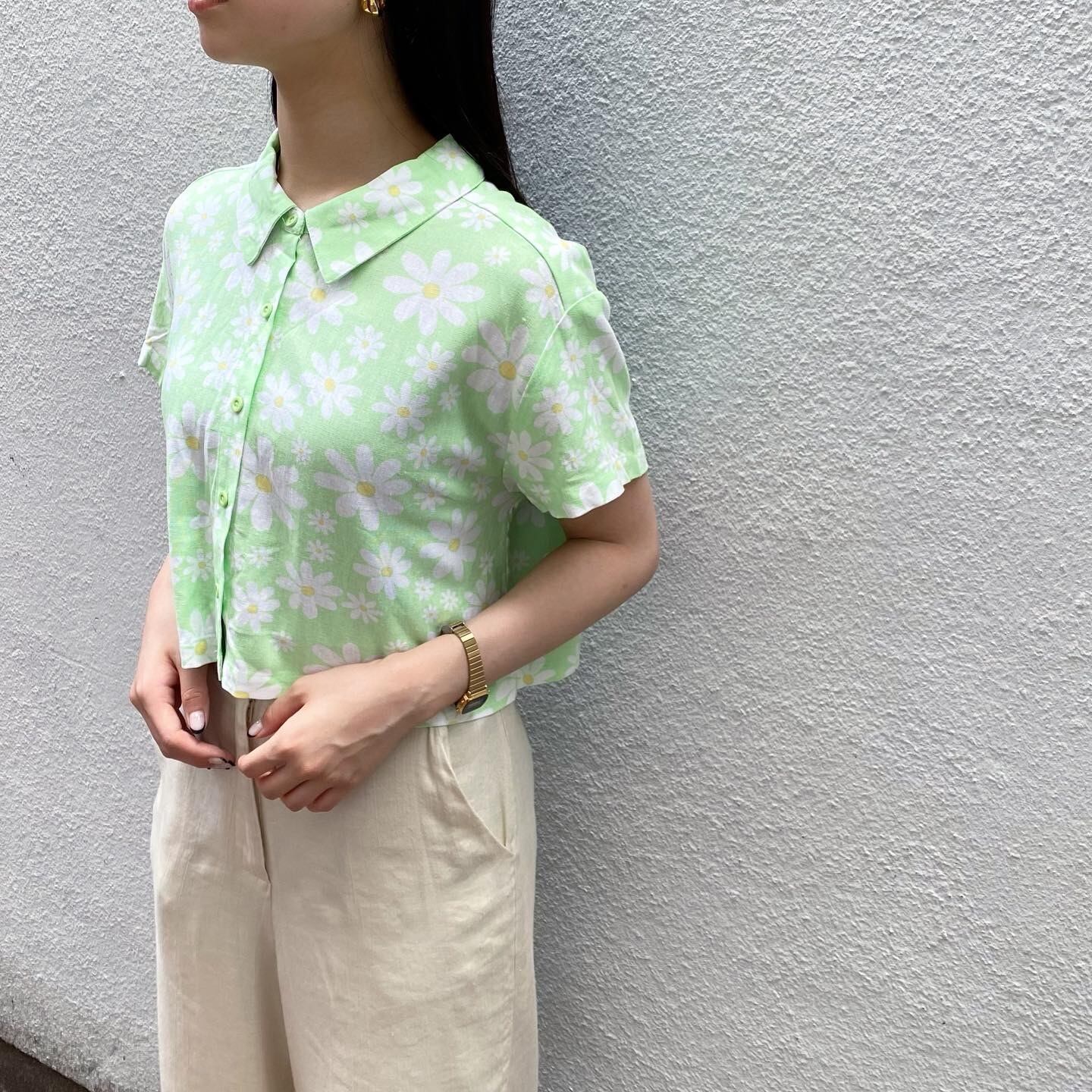 ポップな花柄が可愛らしい半袖シャツです。クロップド丈なのでボトムスとのバランスがとりやすい1着です。