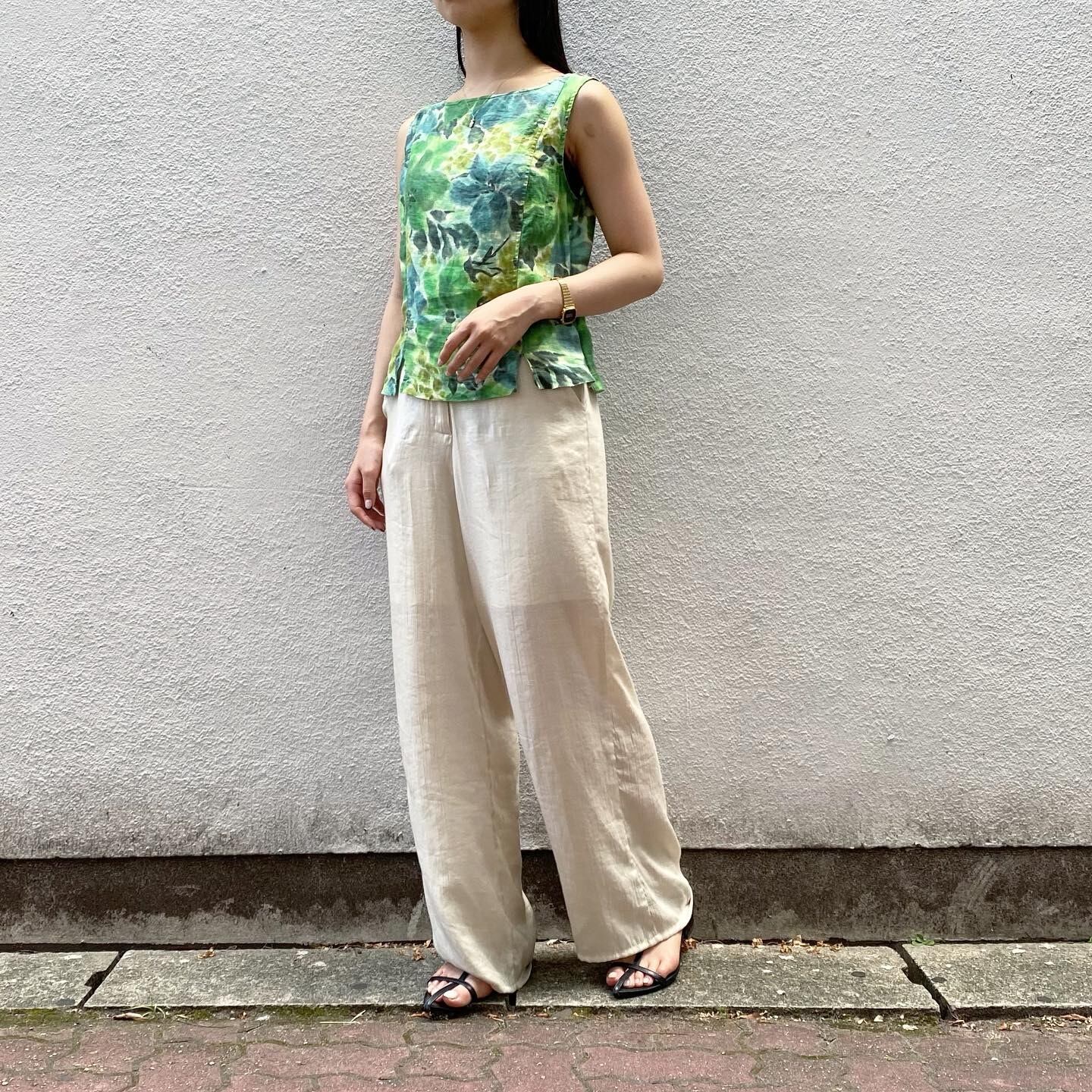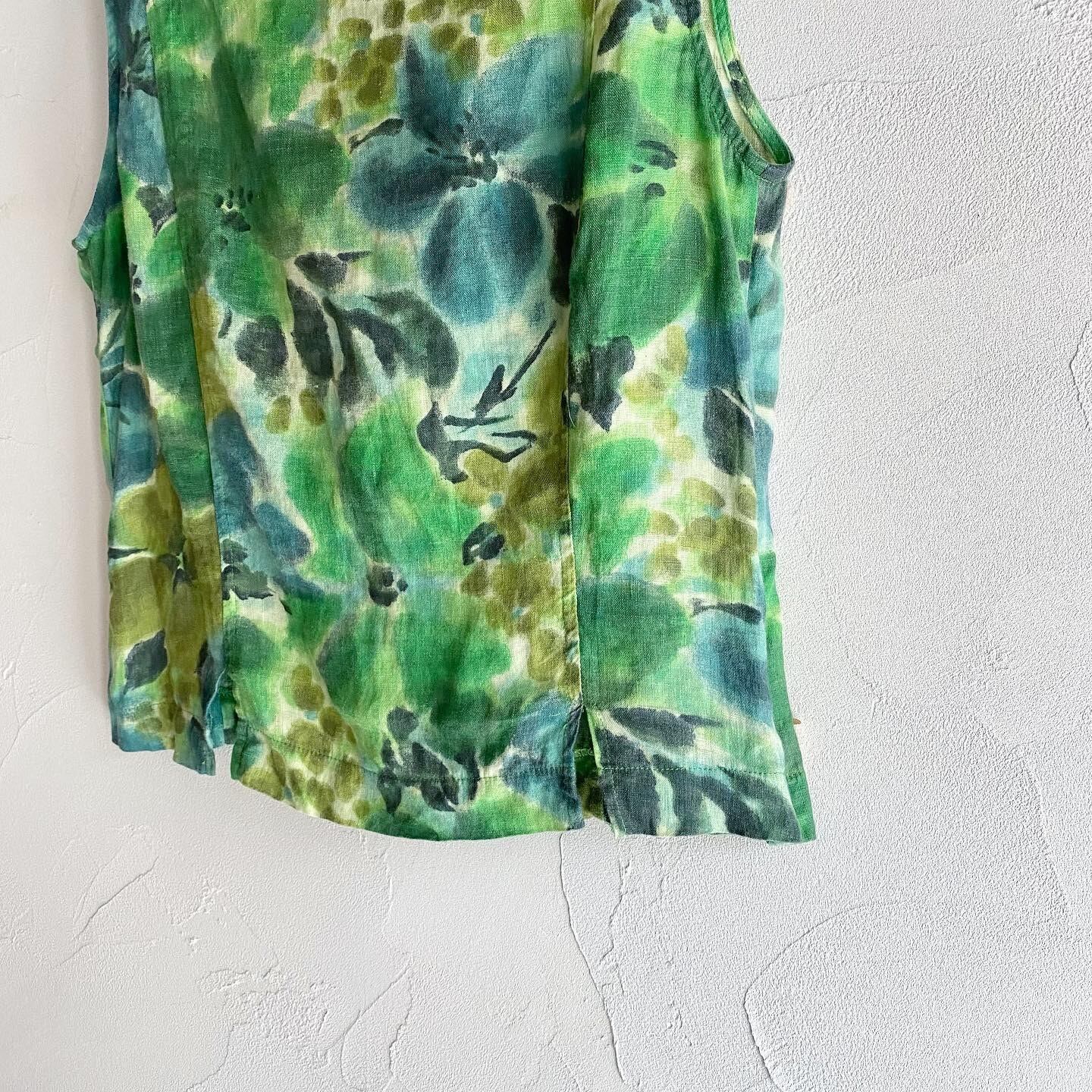 水彩画のようなタッチと色合いが素敵なノースリーブトップスです。ややくびれのあるシルエットで綺麗にお召し頂けます。