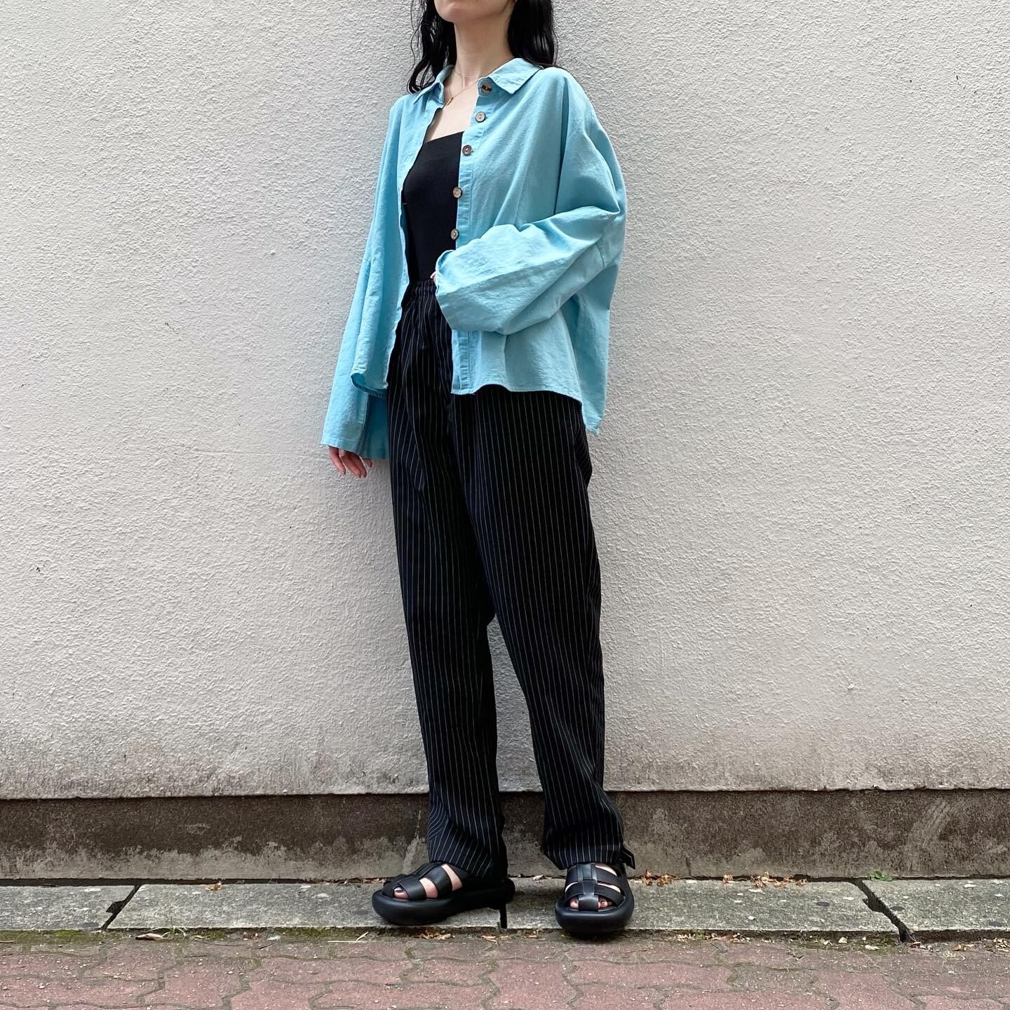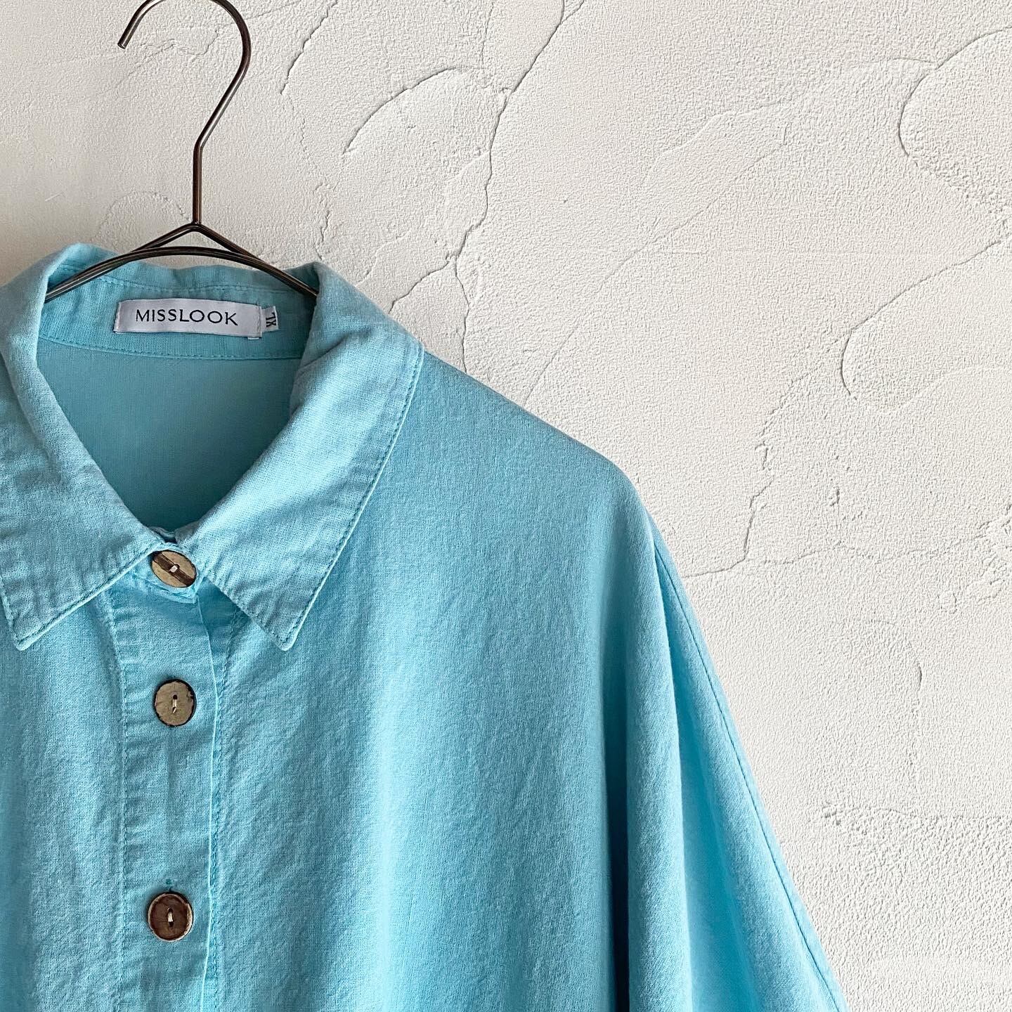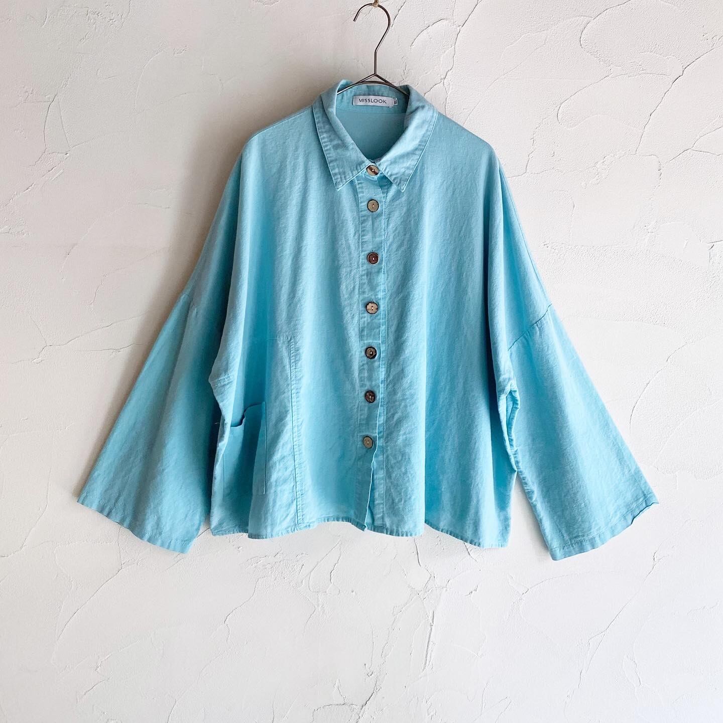 ゆったりした身幅で、シンプルながら一癖あるデザインのシャツです。ウッド調のボタンも雰囲気があり素敵です。