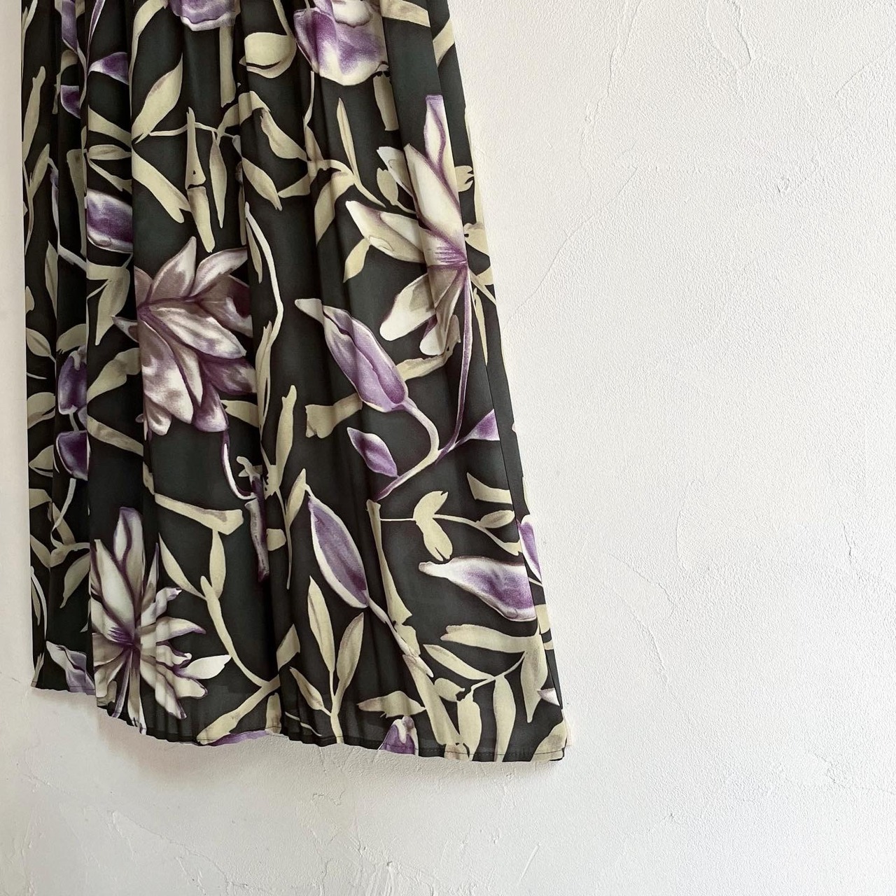 大きな花柄が夏らしいワンピースです。伸縮性のあるプリーツ生地からフレアなシルエットが他には無い一着です。