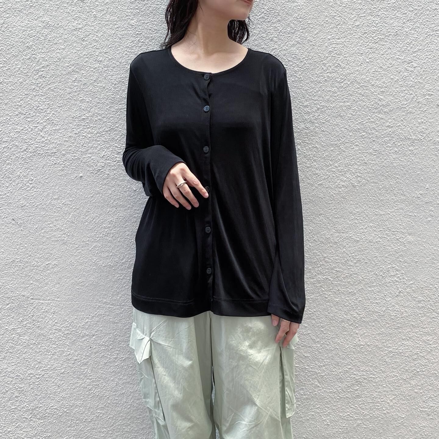 スパンデックス混で伸縮性があり、ひんやりした生地で使い勝手の良いカーディガンです。ゆとりのあるクルーネックですっきりした印象でお召し頂けます。