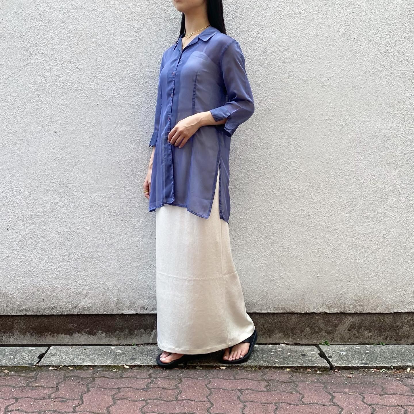 七分袖のコンパクトめなシアーシャツです。少し長めの丈感お、両サイドの深めのスリットがポイントです。