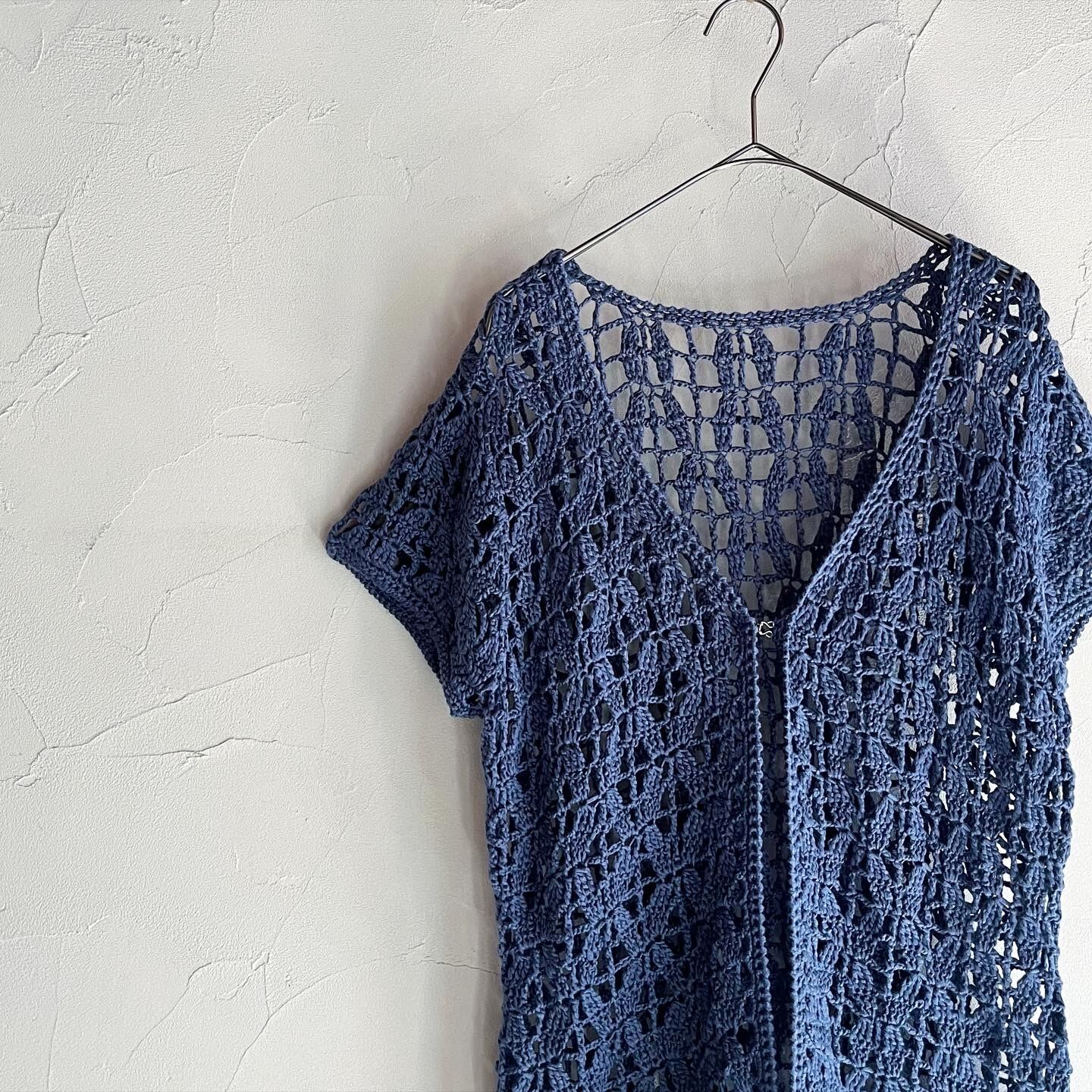 ブルーのくすんだ色味が絶妙なクロシェカーディガンです。フロントのホックがすっきりとした印象でお召し頂けます。