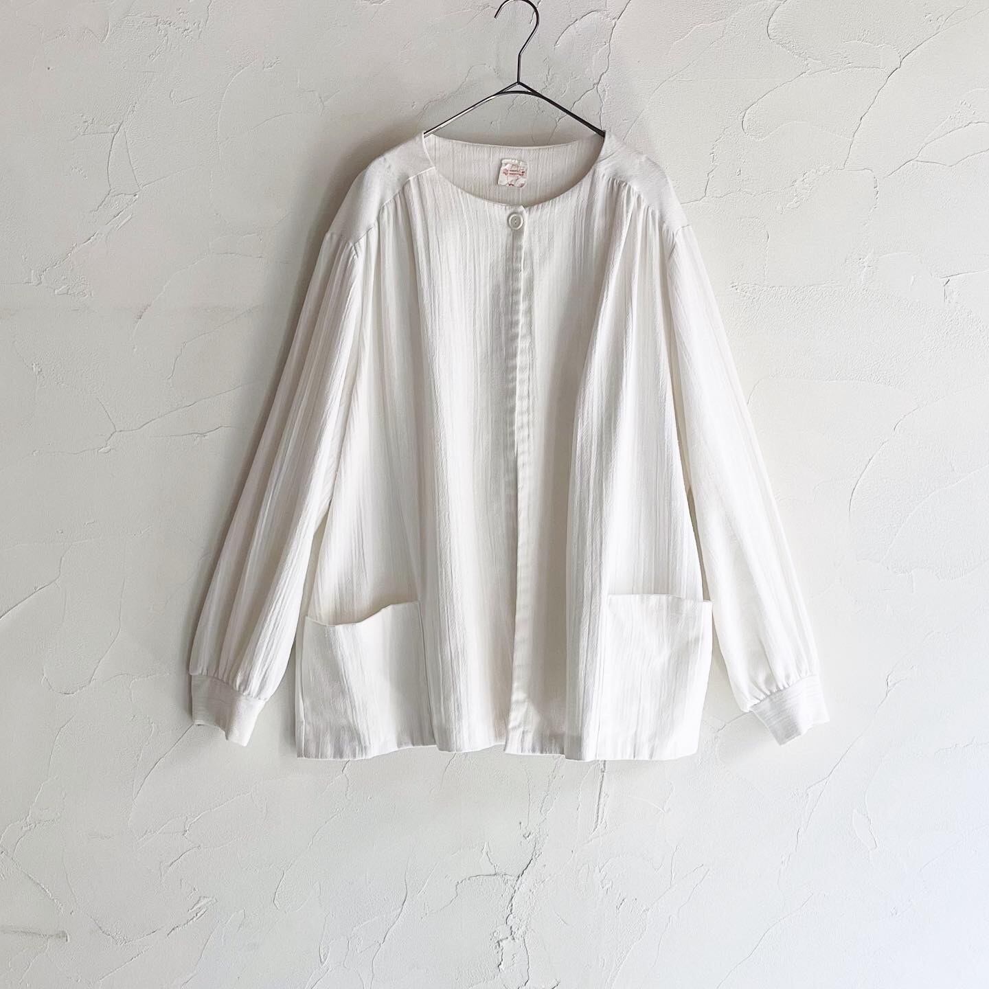 袖にボリュームのあるシルエットが可愛いシャツジャケットです。ノーカラーですっきりとした印象です。