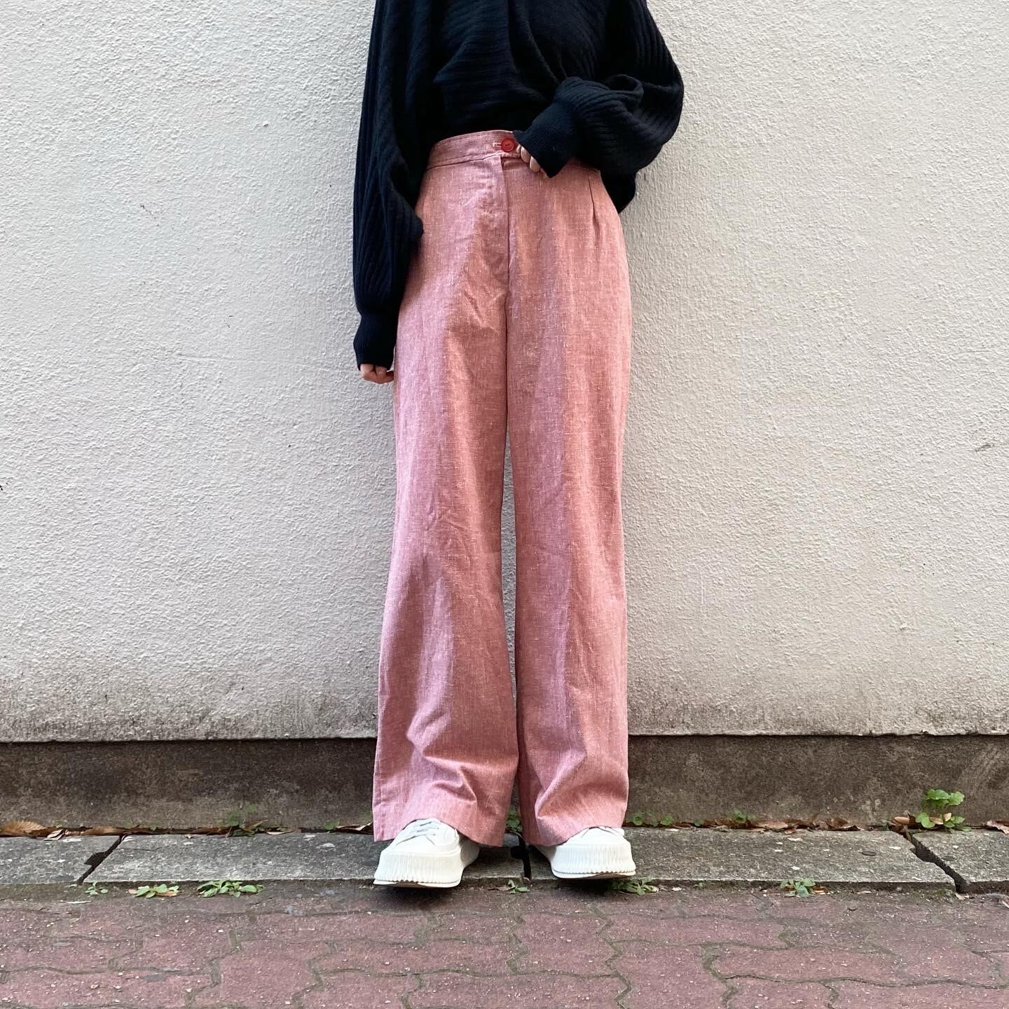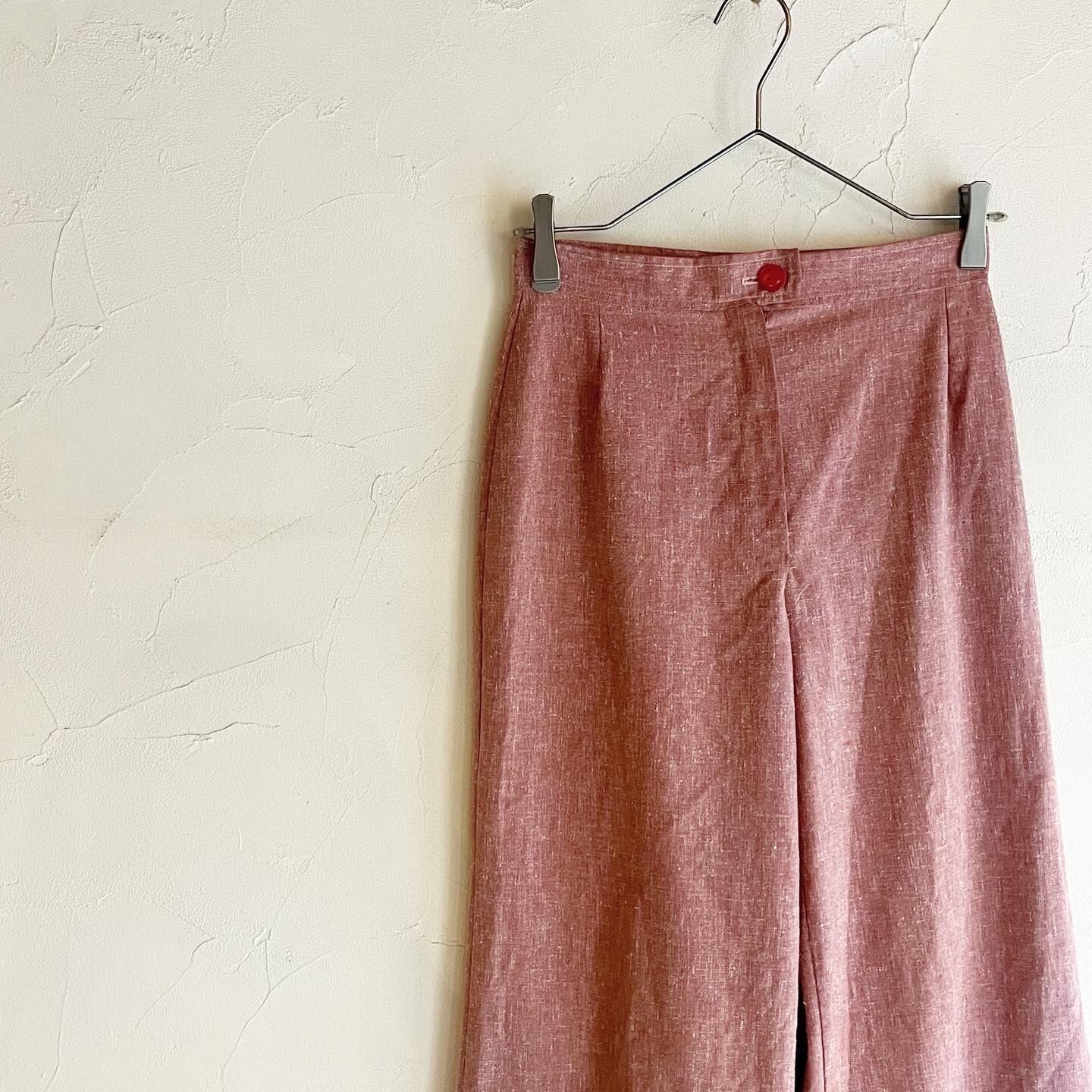 ネップ混のくすんだピンク色が目を惹く70年代のフレアパンツです。股上深めでややハイウエストなシルエットなので、脚長効果抜群の一着です。