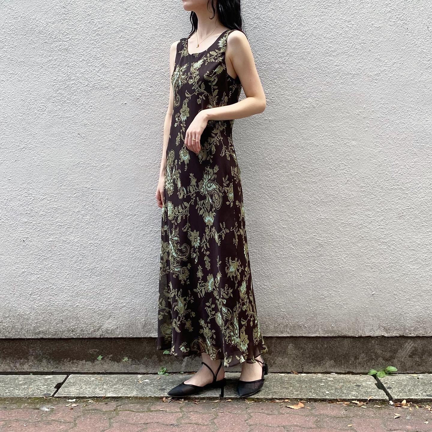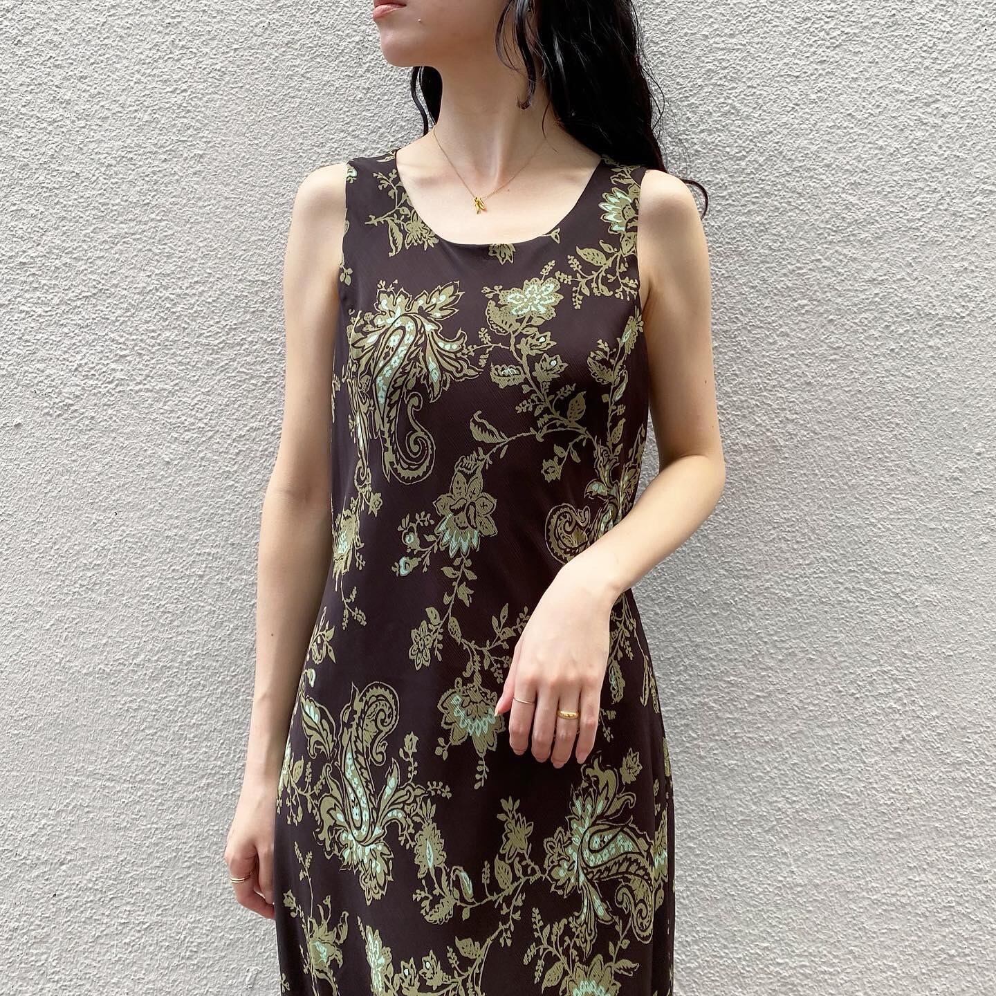 ブラウンとグリーンの配色が素敵なペイズリー柄ワンピースです。