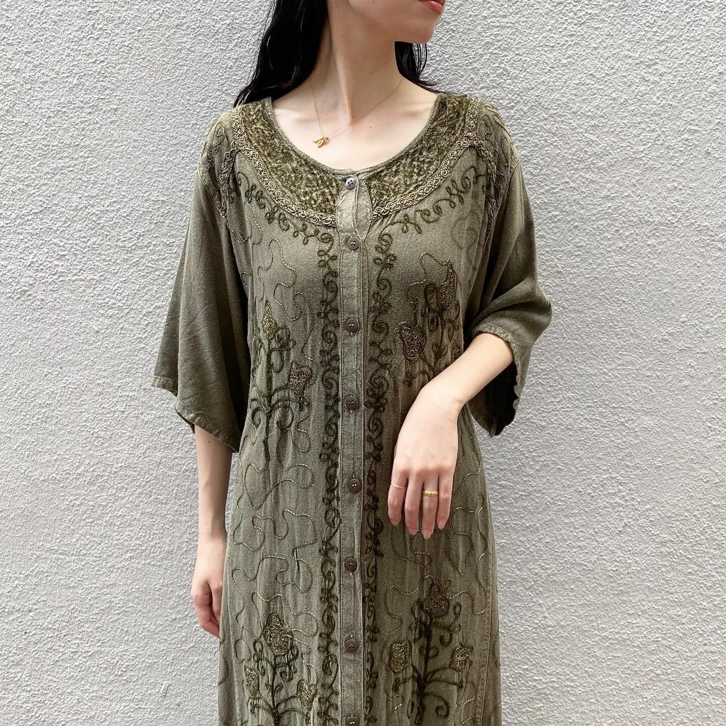 フロントに施された刺繍が美しい半袖ワンピースです。バックにはリボンがついており、シルエットが調節可能です。