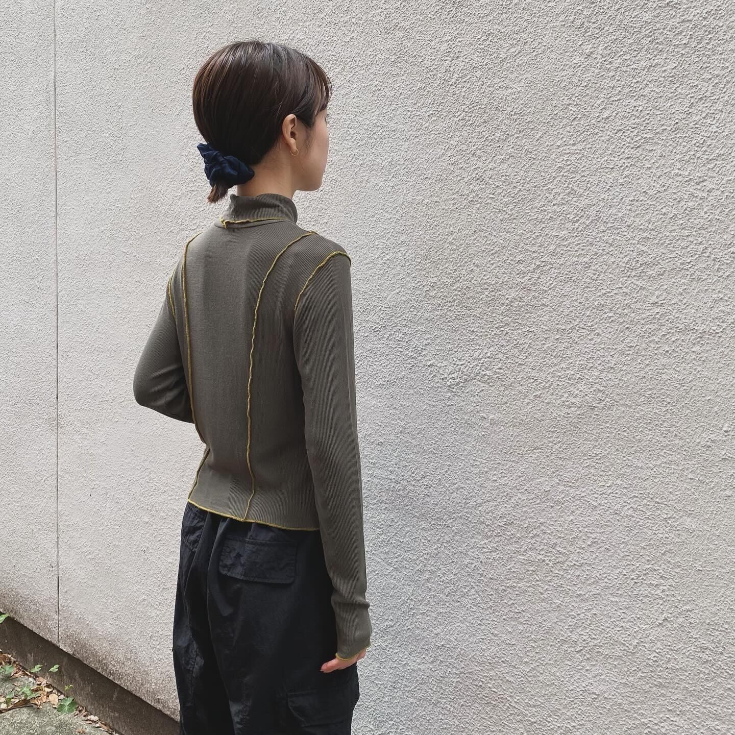カーキにマスタードのパイピングがアクセントになったリブトップスです。1枚で様になり、インナーとしても重宝します。薄手で柔らかく伸びの良い生地感で着心地の良い1着です。