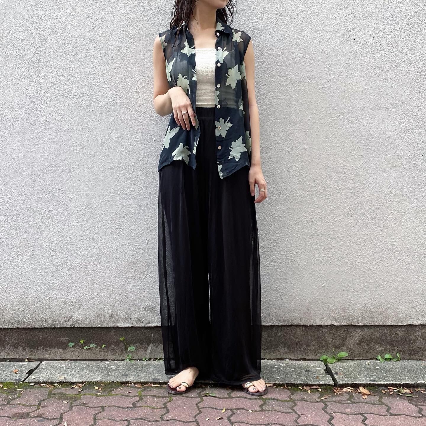 シアー素材と紅葉柄の組み合わせが素敵なノースリーブシャツです。秋らしいパターンと落ち着いた配色で飽きのこない一枚です。