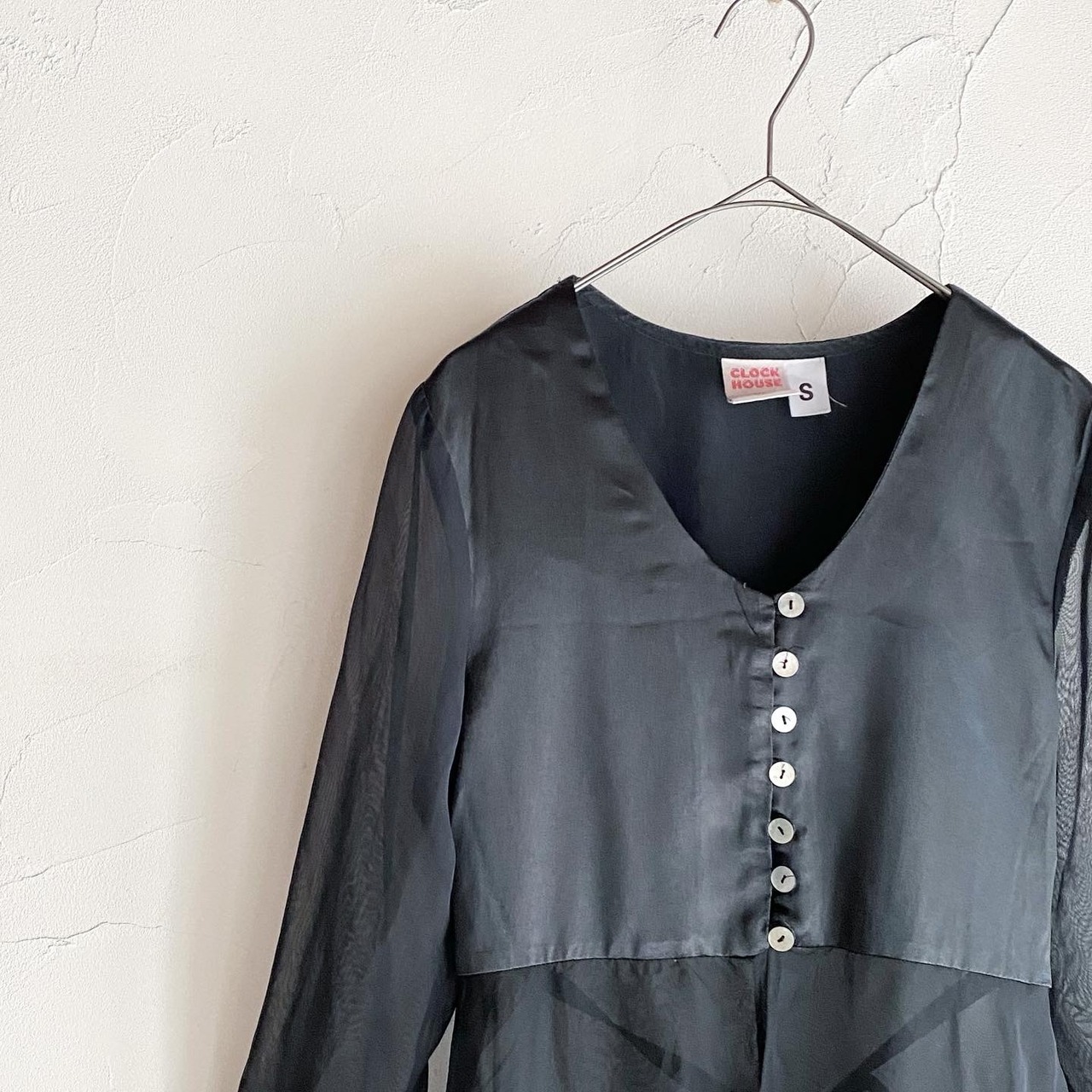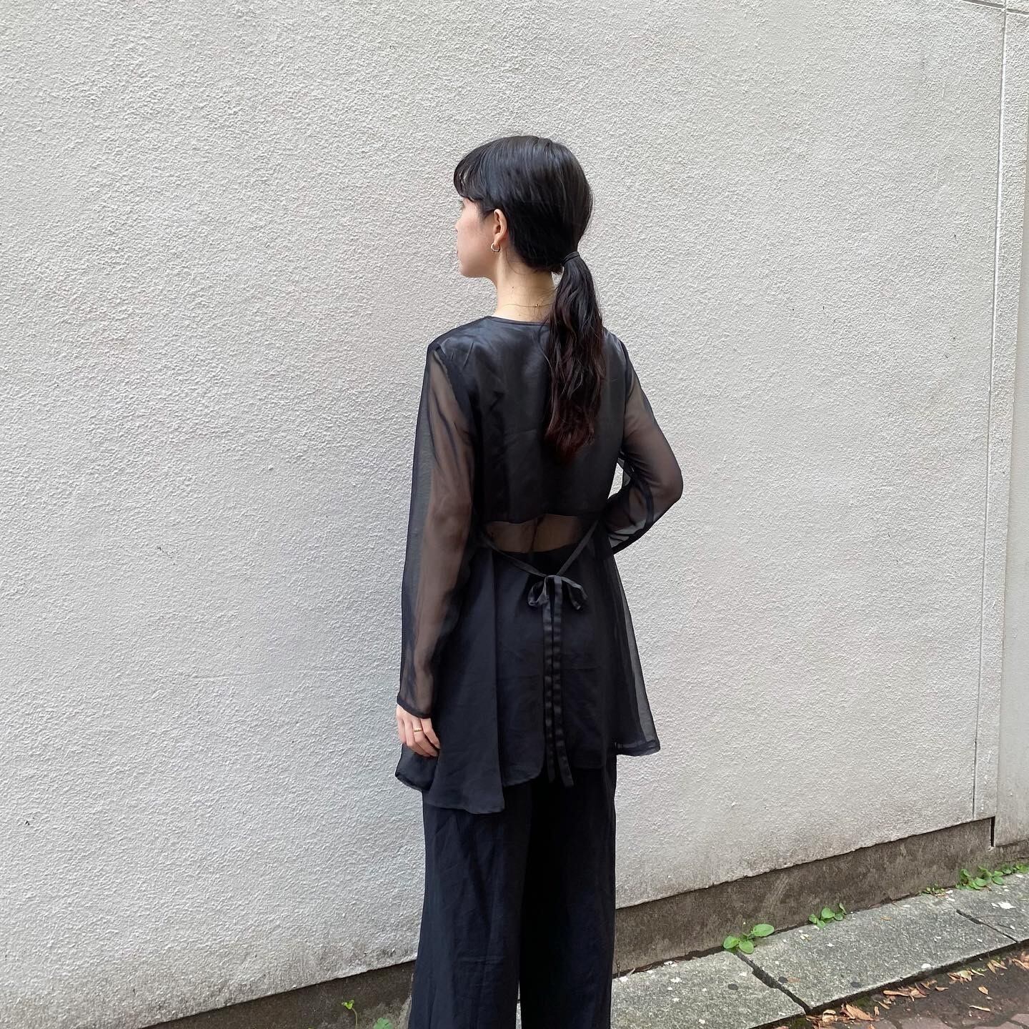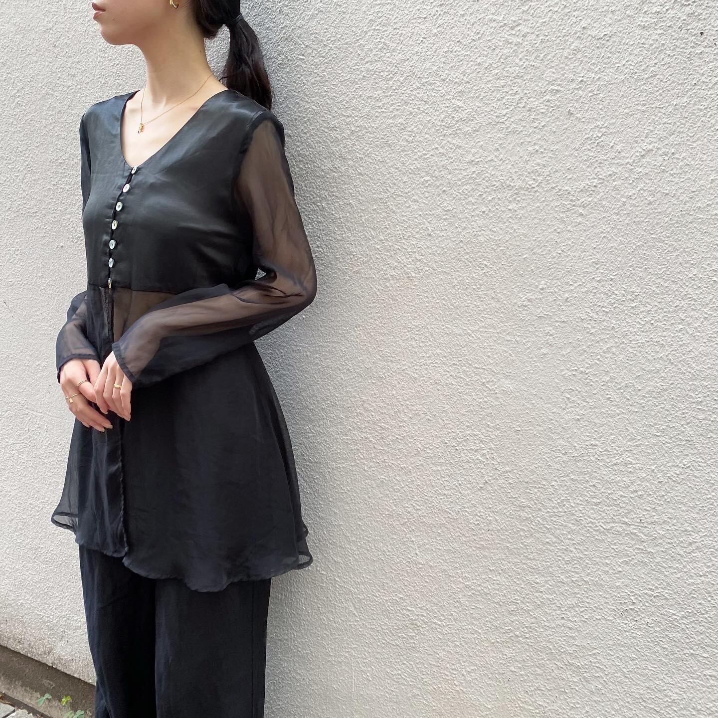袖と下身頃がシアー生地、上見頃がサテン生地のデザイン性の高いシャツです。シェルのボタンやウエストのリボンなど、拘りが詰まった一枚です。