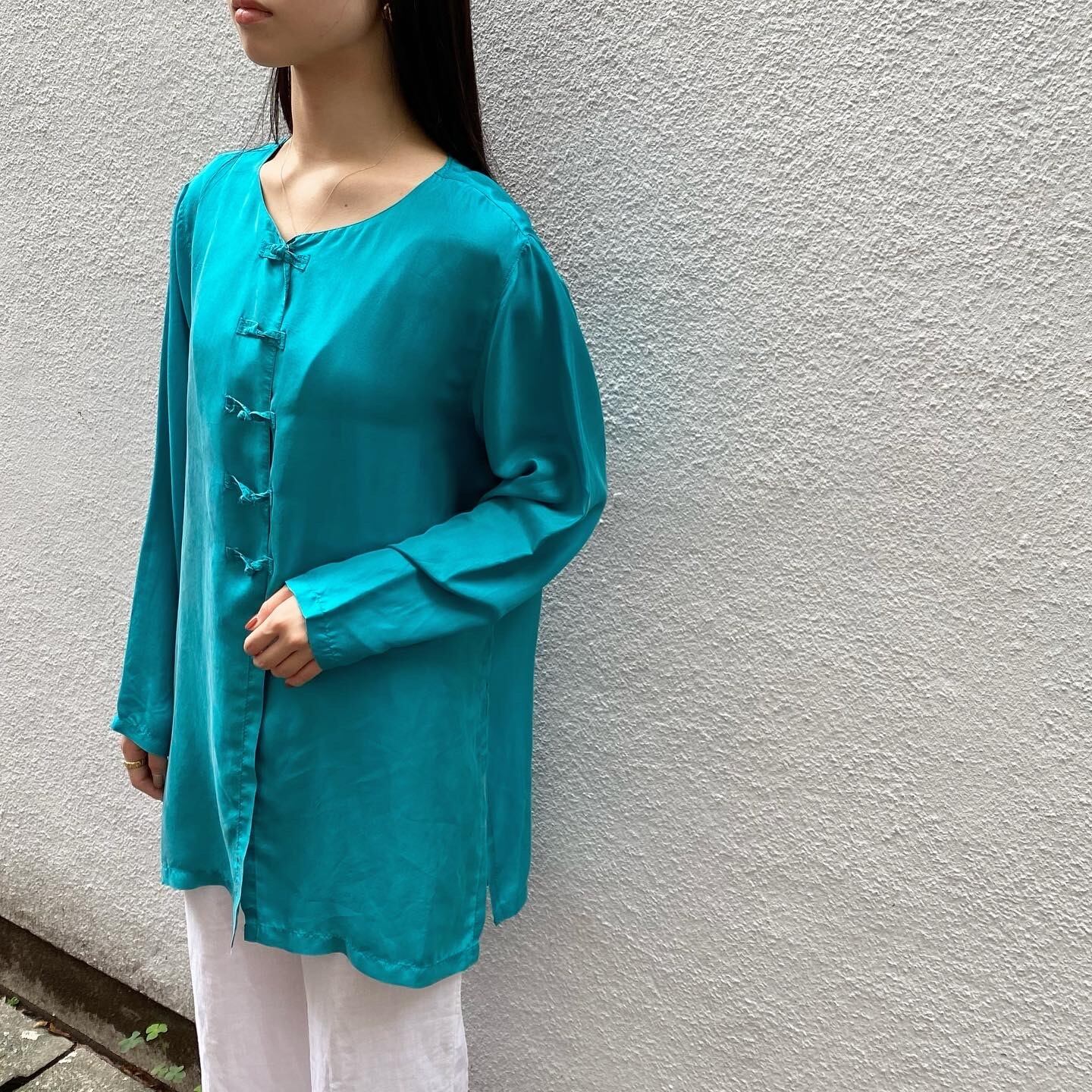 100%シルクのチャイナボタンが素敵なシャツです。ノーカラーなのですっきりとした印象でお召し頂けます。