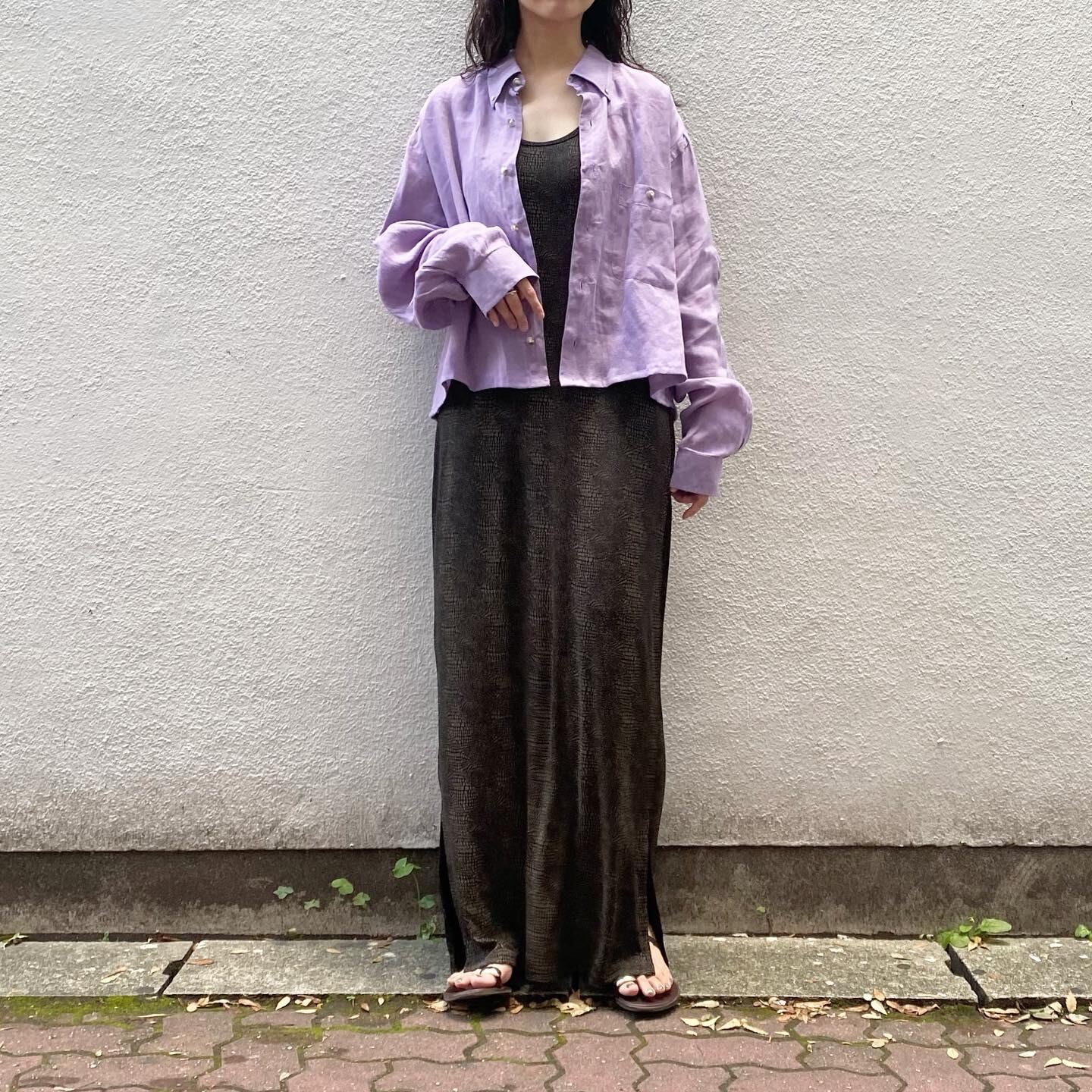 身幅とアーム広めで丈が程よい短さのリネンシャツです。色合いも柔らかくデニムなどにも合わせやすい一枚です。